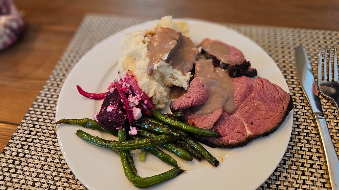 This thing came out amazing, just like a tender prime rib, not dry at all. Made some gravy with the juices from the bag and served with garlic mashed potatoes and green beans.