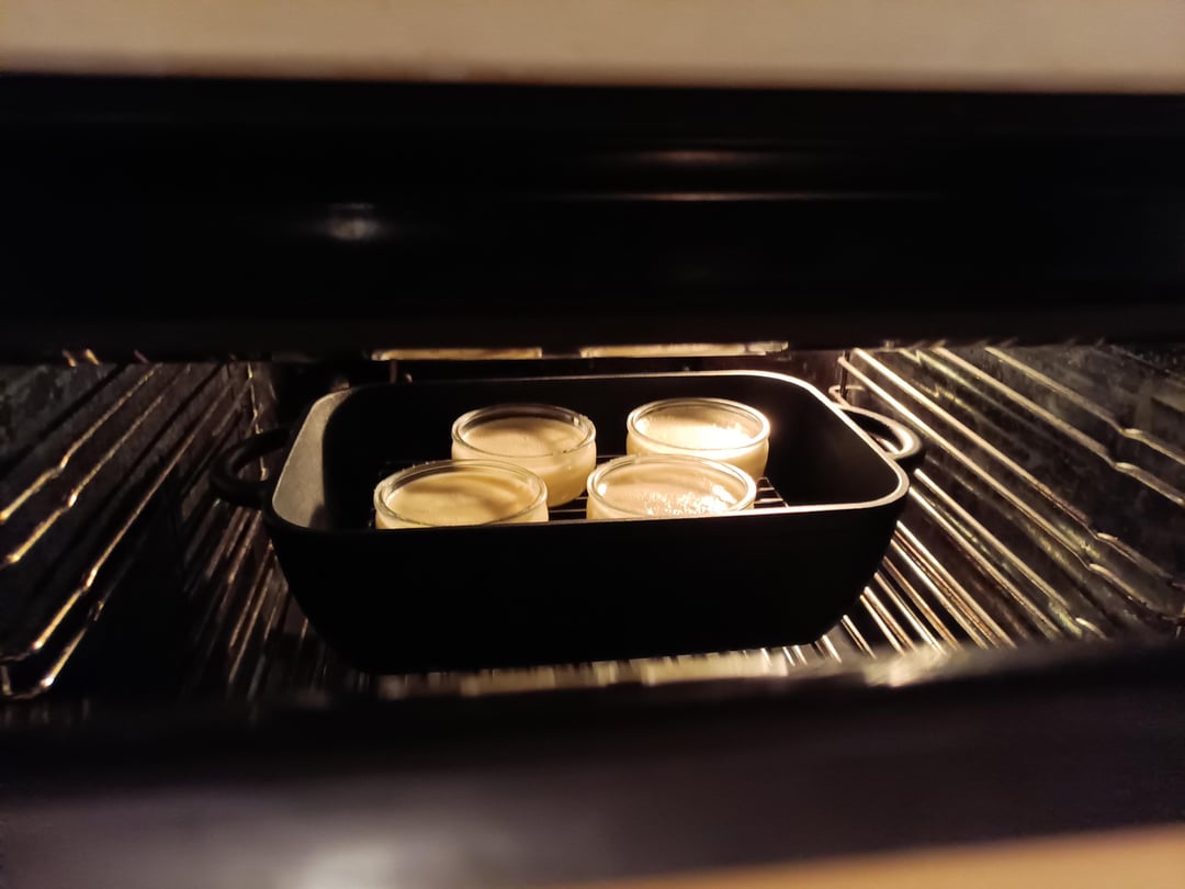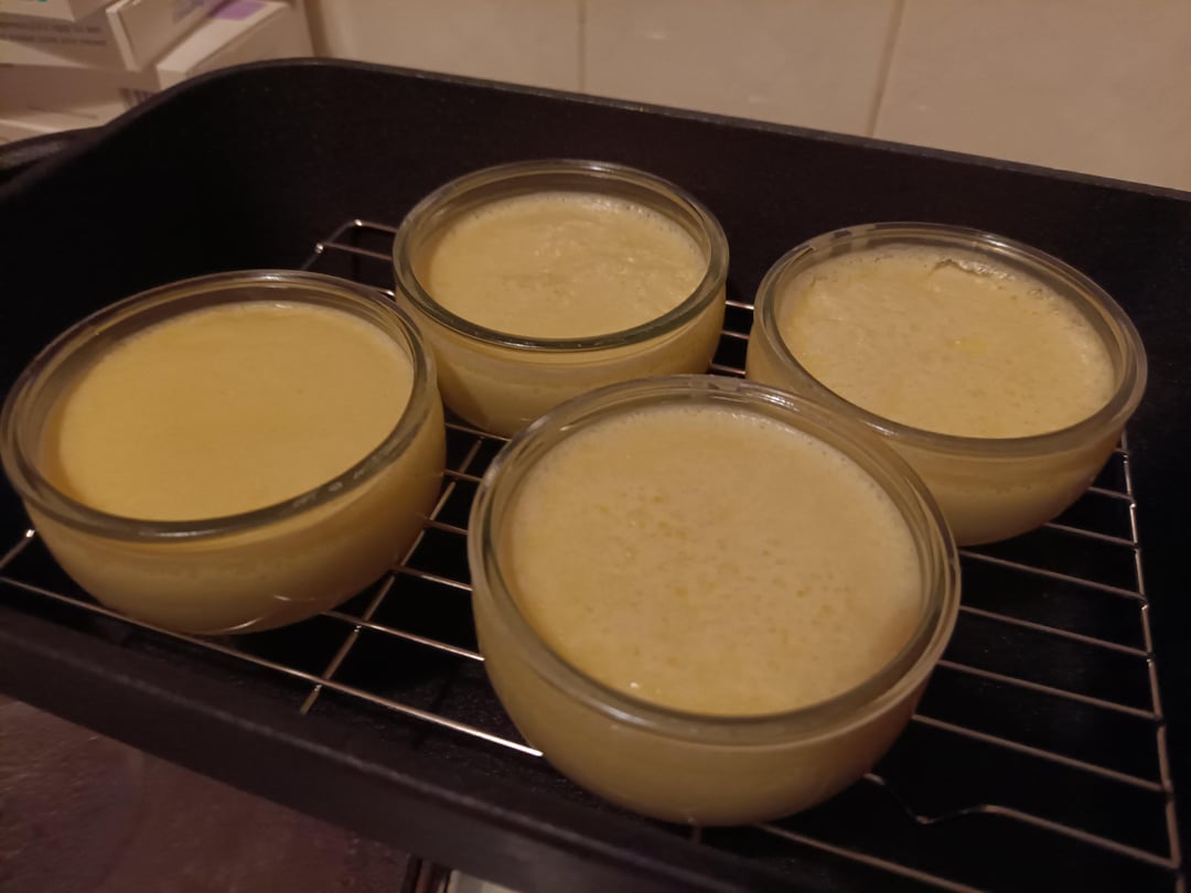 Pour the custard into your ramekins/moulds and bake at 120°C for approximately 30 to 40 minutes – until the custard begins to set-by-baking. That is, if you give the mould a wobble, the mixture/custard should jiggle slightly with more jiggle in the centre. It should be more firm around the edges.
