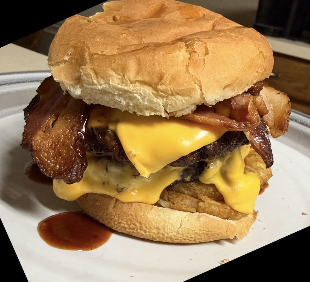 The double western rodeo with cheese, onion ring and bbq sauce.by IndividualAd3796 9 Comments BKPATL 2 months ago 💯👍🏻 Darlingdelight02 2 months ago Look so satisfying! Yumm! Louisiana1979 2 months ago Yummy Sasuke0318 2 months ago You definitely need a better bun that thing ain’t up to the task at hand. MinutesInTheSpirit 2 months ago In the burger rodeo that bun wouldn’t last 8 seconds. That thick bacon & generous cheese are like “com’on man step up your game.” 😂😂😂Bun to bacon & cheese “it’s … it’s… the onion rings making my eyes water.” gordito_y_barbon 2 months ago  CuteBenBC 2 months ago https://i.redd.it/e441e6701ieg1.gif MagazineDelicious151 2 months ago Looks like it was a great burger, nicely done Illustrious-Coat3532 2 months ago Yum yum.