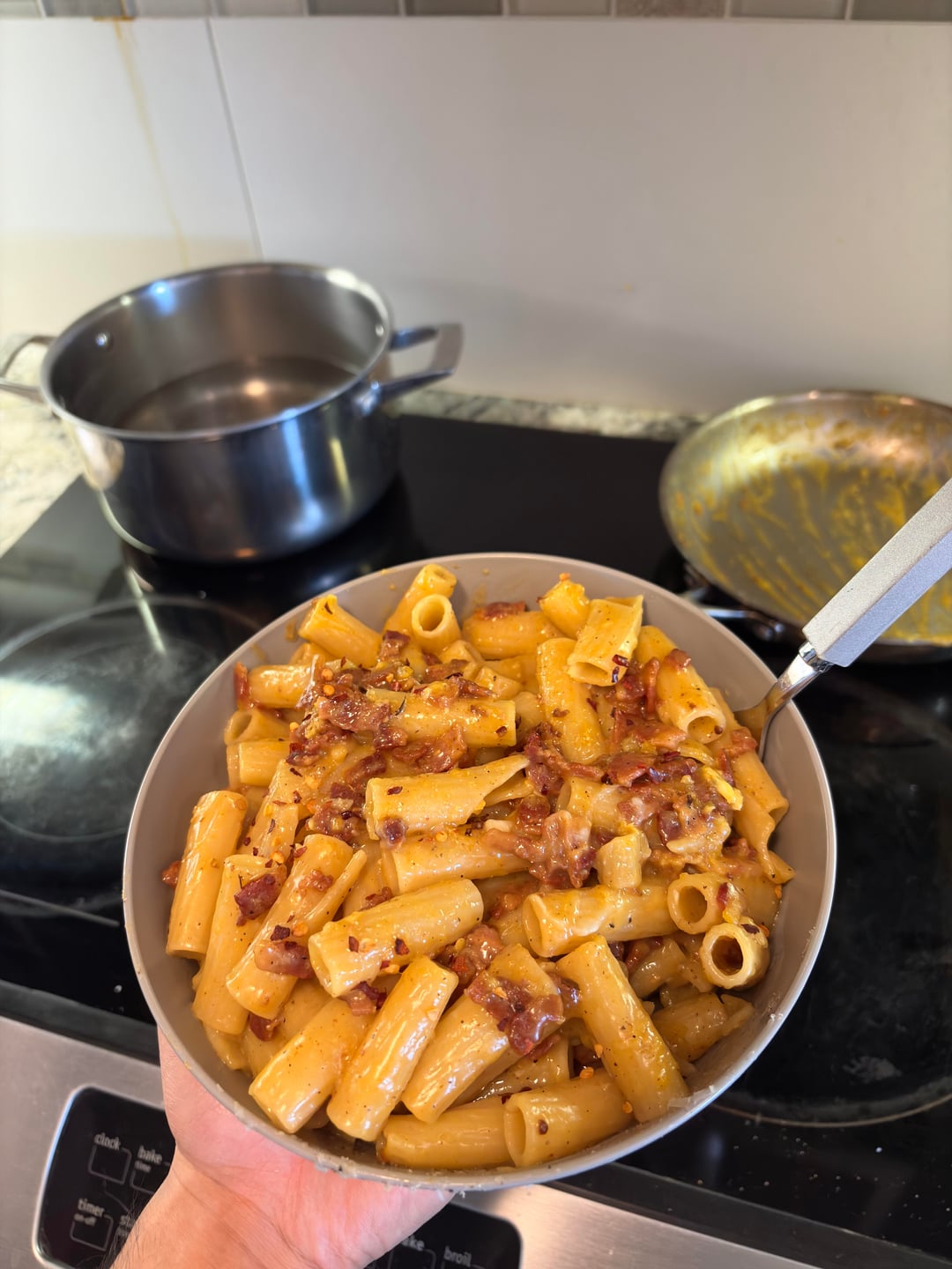 I have made carbonara a few times now, and im feeling increasingly confident with the process. Ive been playing around with different bacon, noodle shapes (not shown here), amount of egg yolk, including egg whites too sometimes, and all kinds of stuff. So, sometimes its too thick, too salty, or too watery, or not enough egg… you get it. Im trying to figure out a balance