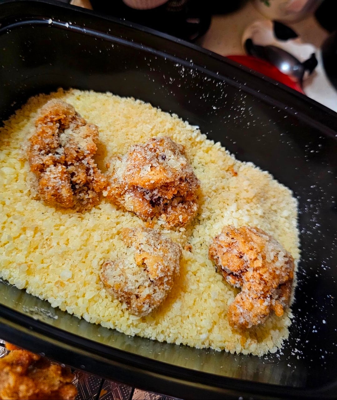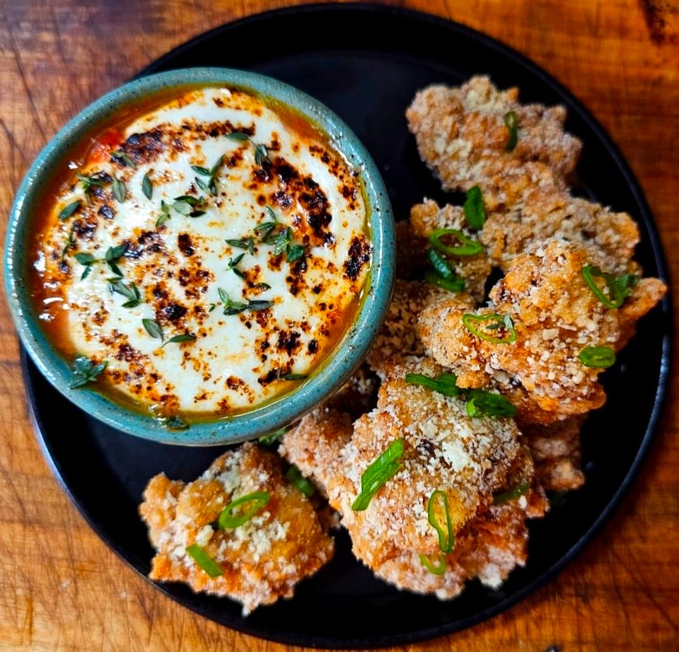 Coat in cornstartch w/ garlic & onion powder, fry until crispy, then shake in grated parm, and serve with some melted mozz on top of warm sauce 😁