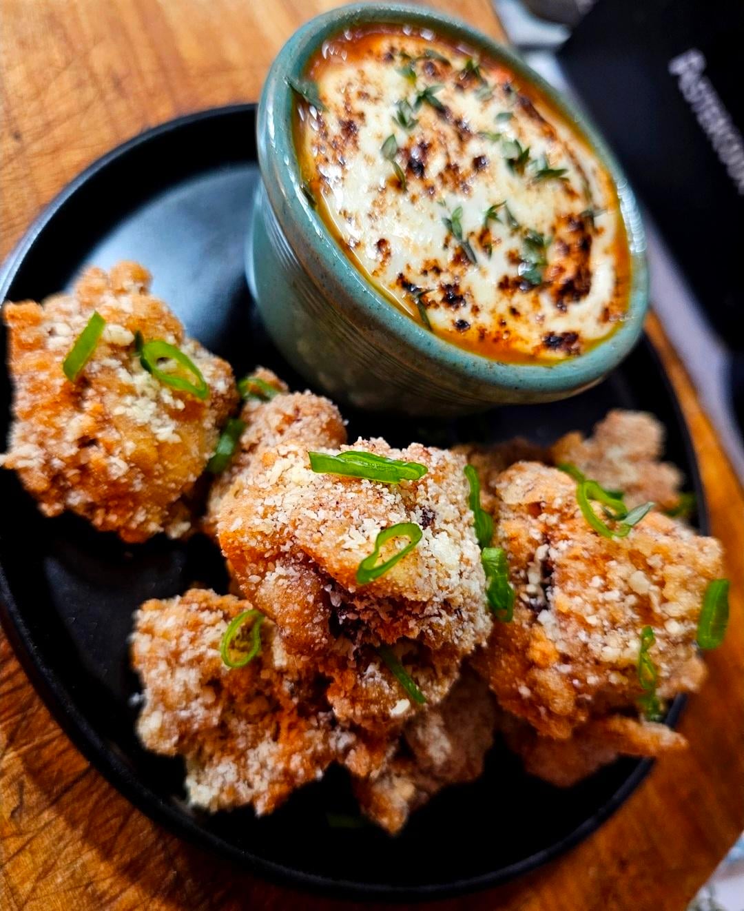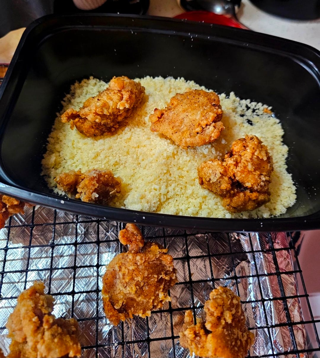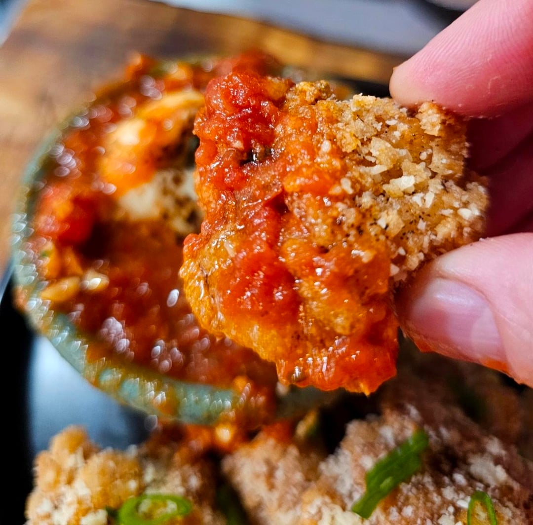 Coat in cornstartch w/ garlic & onion powder, fry until crispy, then shake in grated parm, and serve with some melted mozz on top of warm sauce 😁