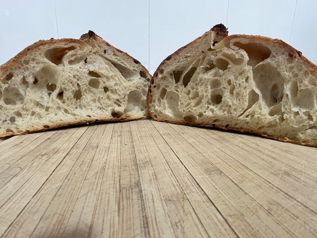 300g water 100g starter 450g flour 10g salt Bulk fermentation: 7 hours at 18Β°C, then chilled for 12 hours. Baked in a Dutch oven: 255Β°C for 20 minutes with a lid, then 240Β°C for 20 minutes without a lid.