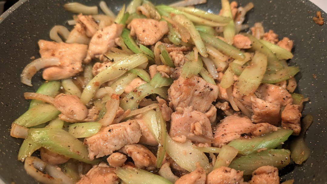 - Set chicken aside. In the same pan stir fry thinly sliced celery hearts (I only like the pale green parts, will use the dark stalks for soup) and sliced onions for about 30 seconds. Add some cooking wine to deglaze.