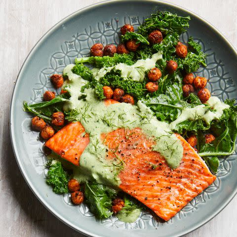 In this healthy salmon dinner, you’ll get a dose of greens and green dressing! Chowing down on 6 or more servings of dark leafy greens a week can help keep your brain in top shape. This dish features the Test Kitchen’s current go-to method for doctoring a can of chickpeas: spice them up and roast until crispy.