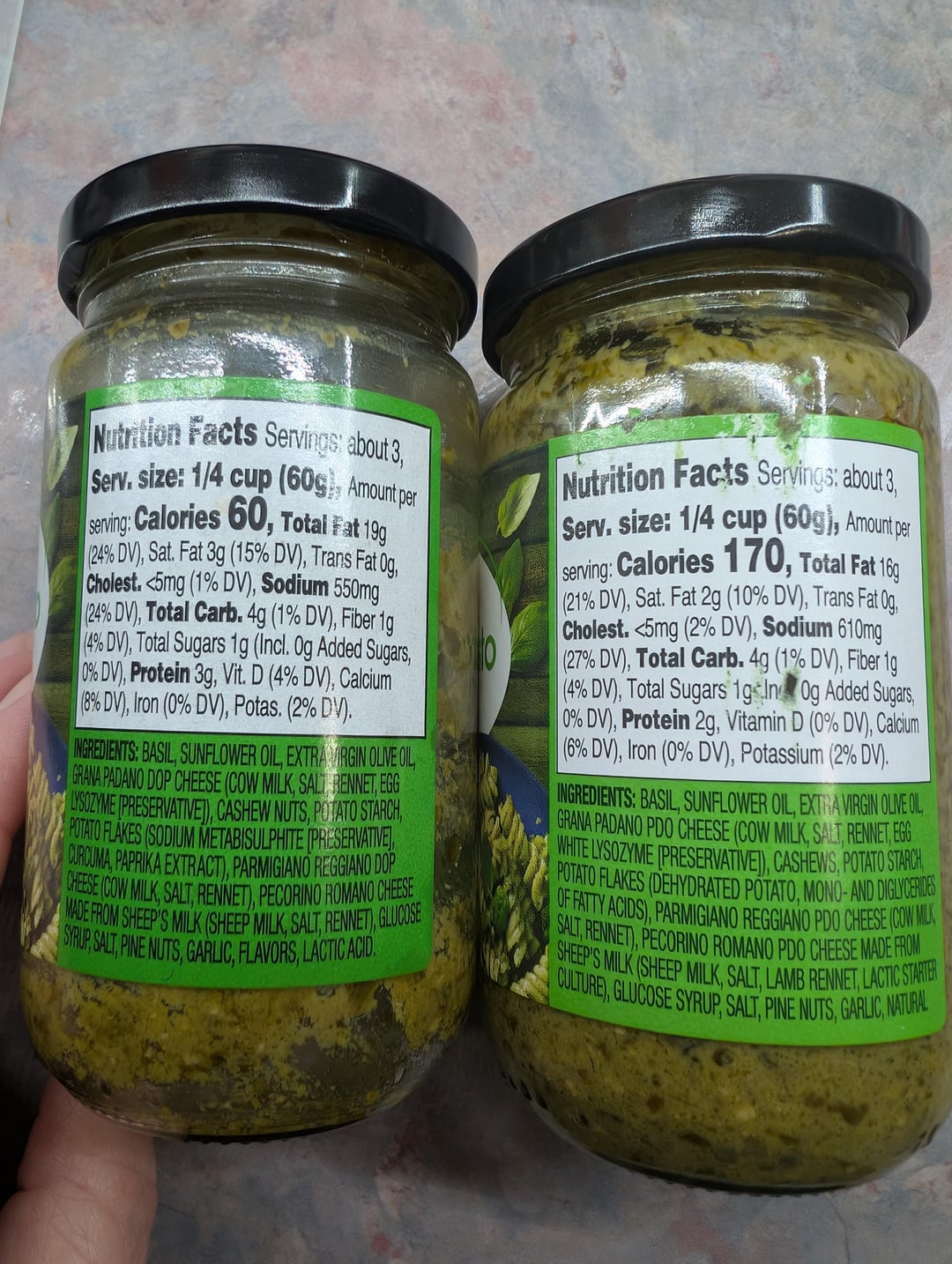 If anyone also uses the great value pesto, the recipe has changed. It was 60 calories for a 1/4 of a cup and is now 170 for a 1/4 of a cup. It was a regula purchase for me, so I didn't check. The packaging is still the same. Does anyone know a brand with a lower calories?