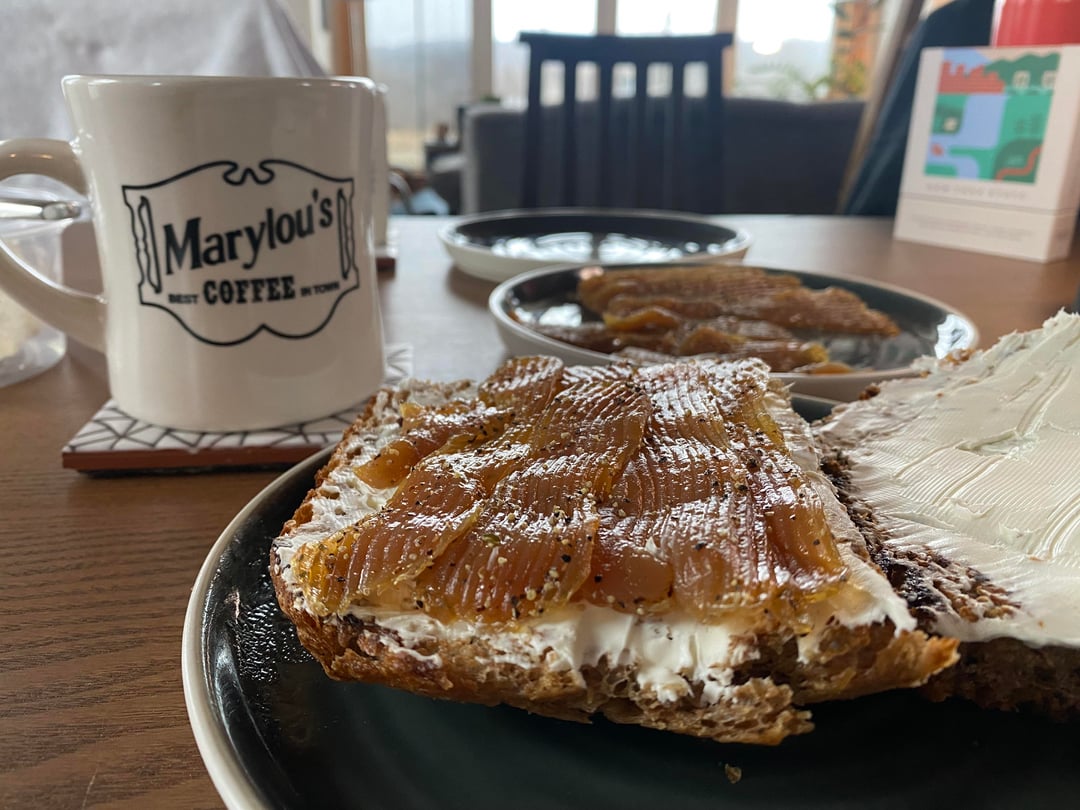 I sliced the yam cake on a mandolin and placed the slices in boiling water with a kombu sheet for 1 minute. I marinated them in the fridge for 24 hours in the soy sauce, MSG, food coloring, and sea stuff. (I pulsed the kombu and seaweed in a spice grinder until fine.) Rinse the slices, pat dry, then toss with the brown sugar, salt, and black pepper. I used a smoke gun with applewood, but I’m sure you could use liquid smoke.