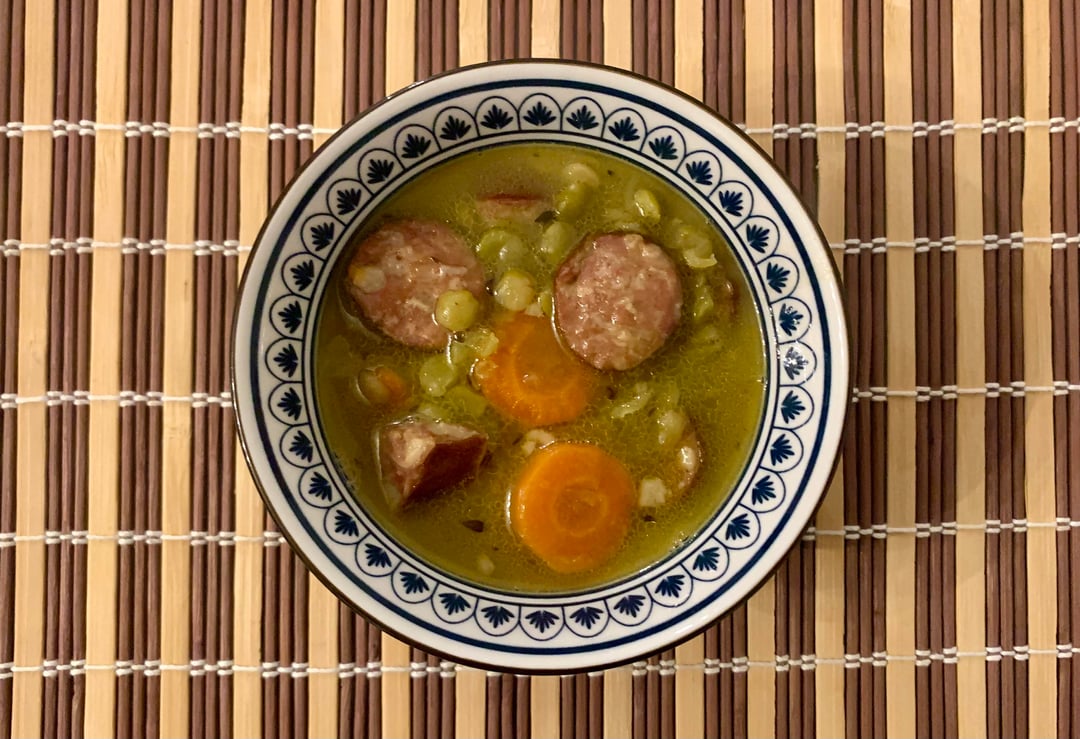 Brown the smoked sausage (here 4 medium sausages) with three onions and two carrots. Once everything is nicely golden, add a little water, a vegetable stock cube and a bouquet garni. Then add one bowl of split peas, rinsed under cold water beforehand, followed by another bowl of water. Let it cook uncovered for about 30 minutes, adding water regularly. Add some freshly ground pepper. When there’s just a bit of liquid left, cover and let it simmer over low heat for one hour. Enjoy! 😋