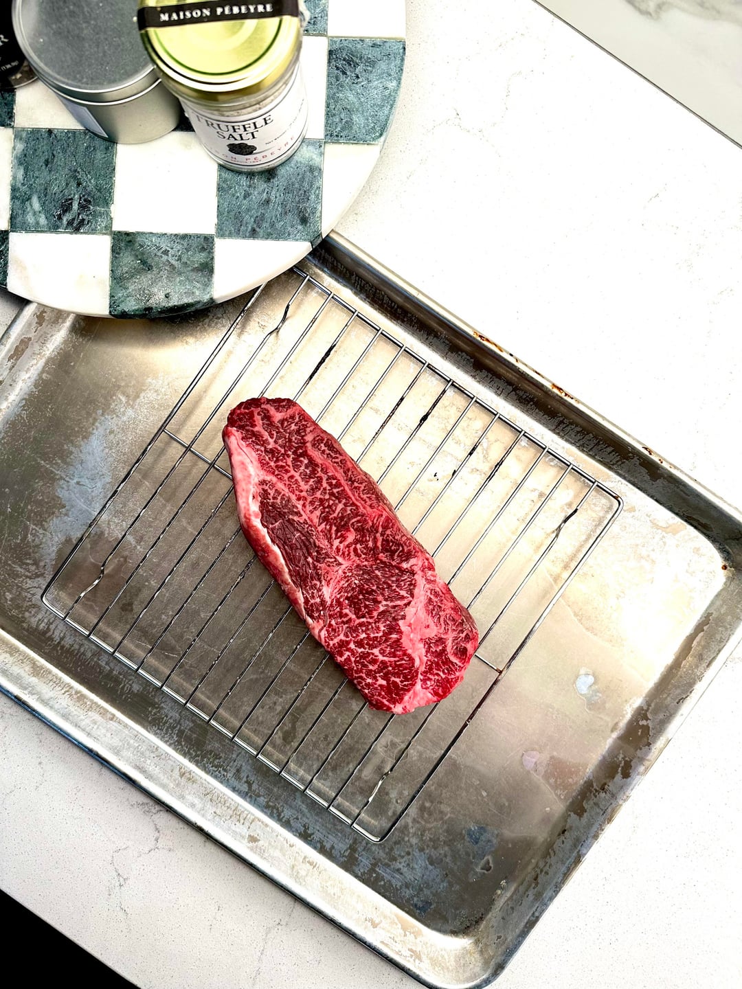 American Wagyu NY Strip cooked in cheap stainless steel pan.