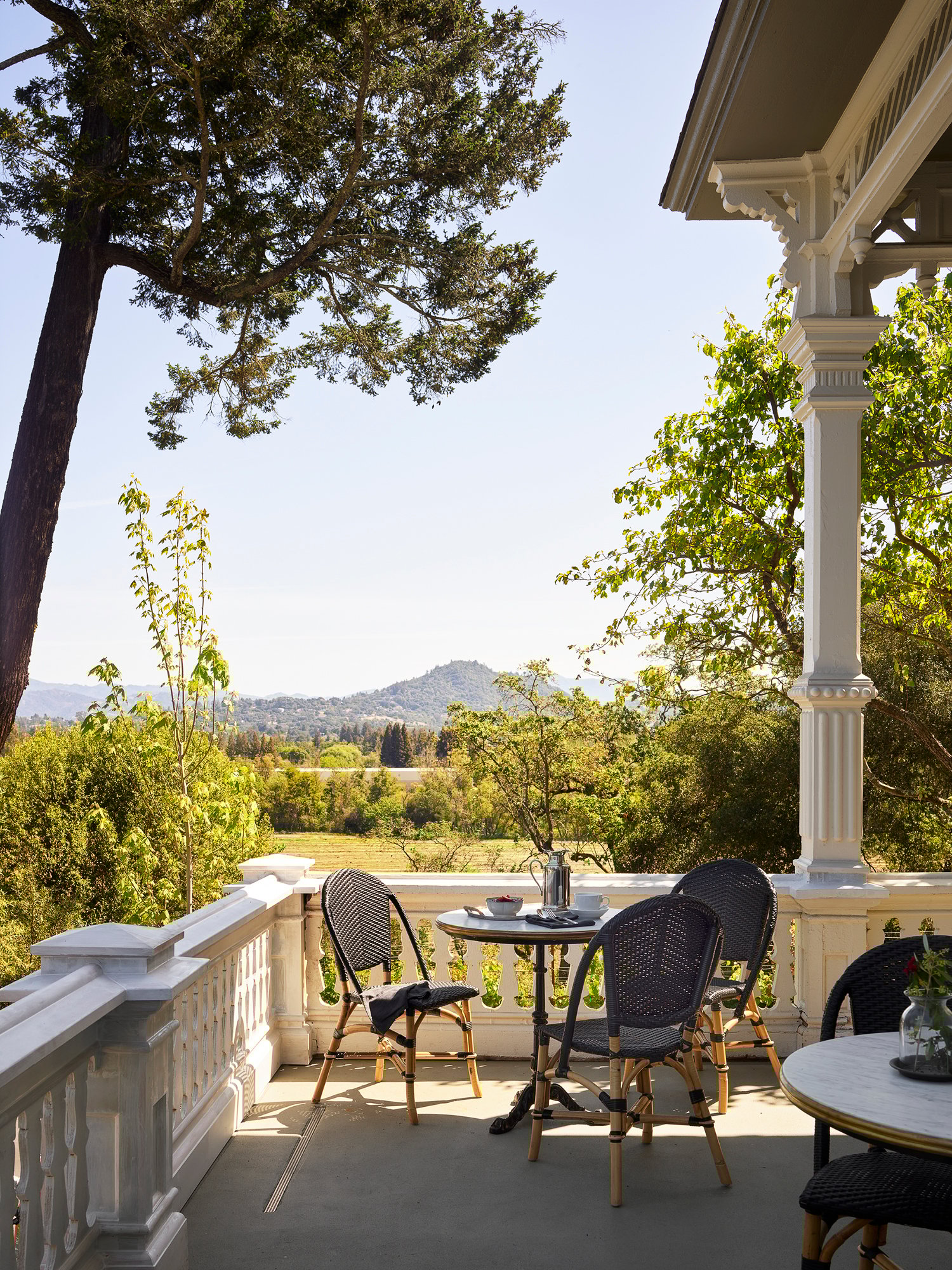 From the outside, The Madrona’s showpiece High Victorian architecture makes quite the first impression. As the steep driveway winds up the hillside past rows of grapevines, the imposing mansion that presides over the valley below comes into view. Built in 1881, the residence’s pitched gables, bay windows, and ornate soffit and porch detailing may remind some of Henry Creel’s house in Stranger Things. Lush gardens surround the white-clapboard walls and wraparound porch, enhancing the grandeur of the stately home.