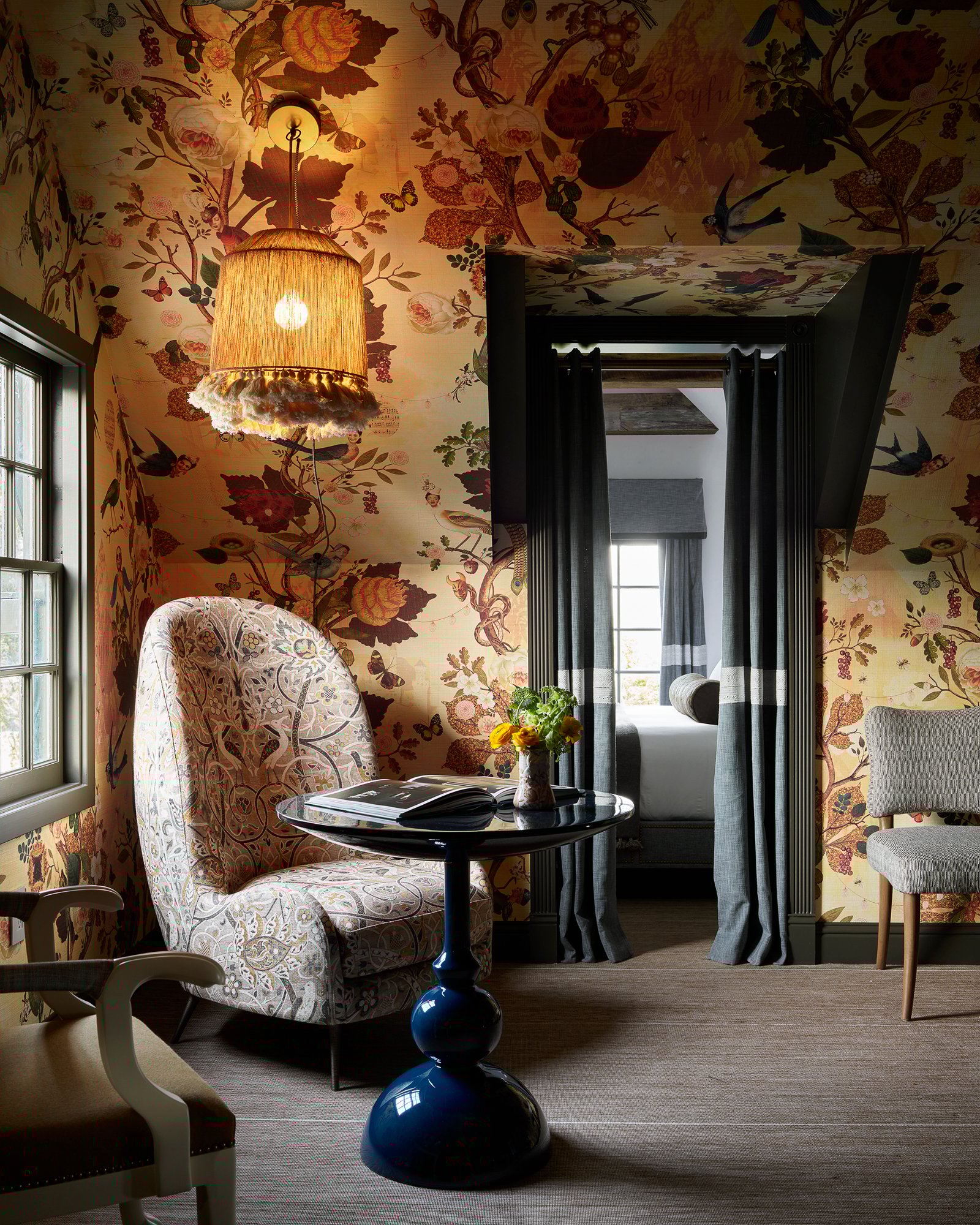 The hotel’s draw is its individuality: its architecture, design, landscape, and location come together to create an experience unlike anywhere else. The maximalist style of the interiors is certainly not for everyone—and that’s part of the allure. Those who appreciate a collected approach to décor—one that is consistent in its intentional incohesiveness from room to room—will relish discovering new objects and artifacts every time they scan a space. Bright and airy in summer and wonderfully cozy in winter, this property is a year-round escape into the unbridled imagination of its designer and co-owner, Jay Jeffers.