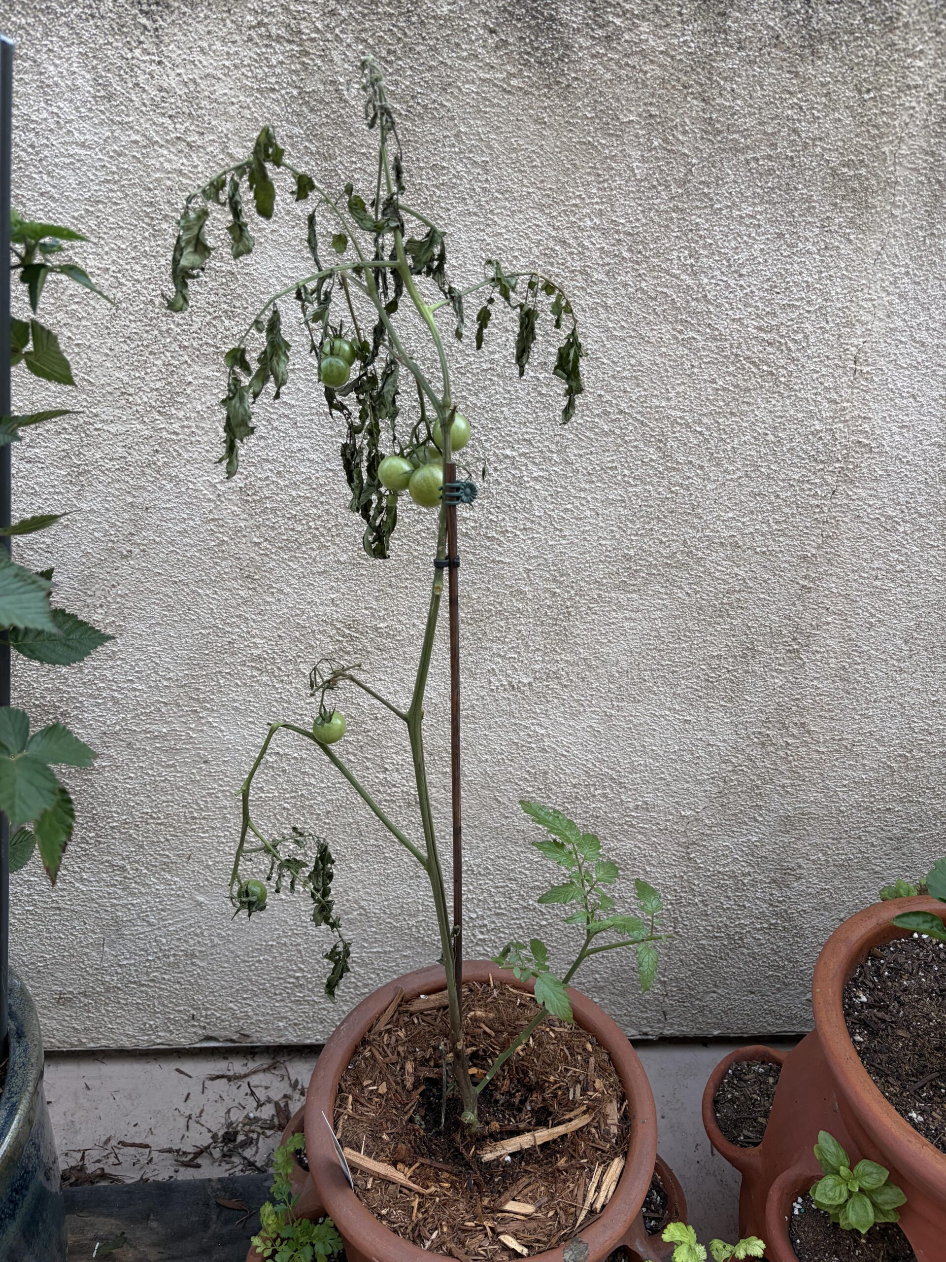 Bought this tomato plant in November, we experienced a cascade of rain over a couple weeks at the start of the year. Saw quite a few ants the last couple weeks and some aphids a few days ago (I sprayed them off when I noticed the wilting and took a better look).