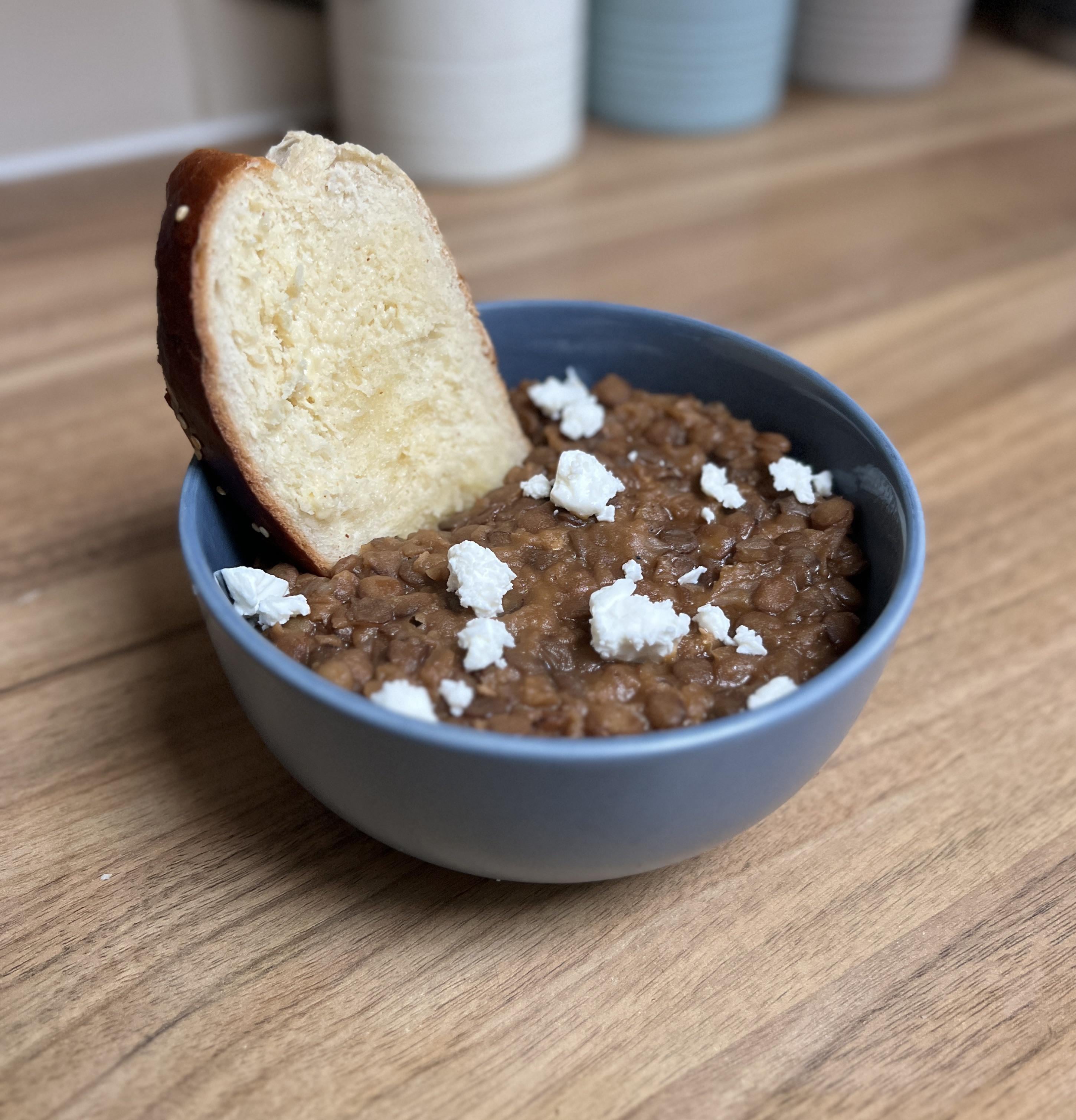 Made with lentils, garlic and bay leaves and slow cooked. Feta cheese crumbled and sprinkled over. Served with challah for dipping purpose.by Llewur Dining and Cooking