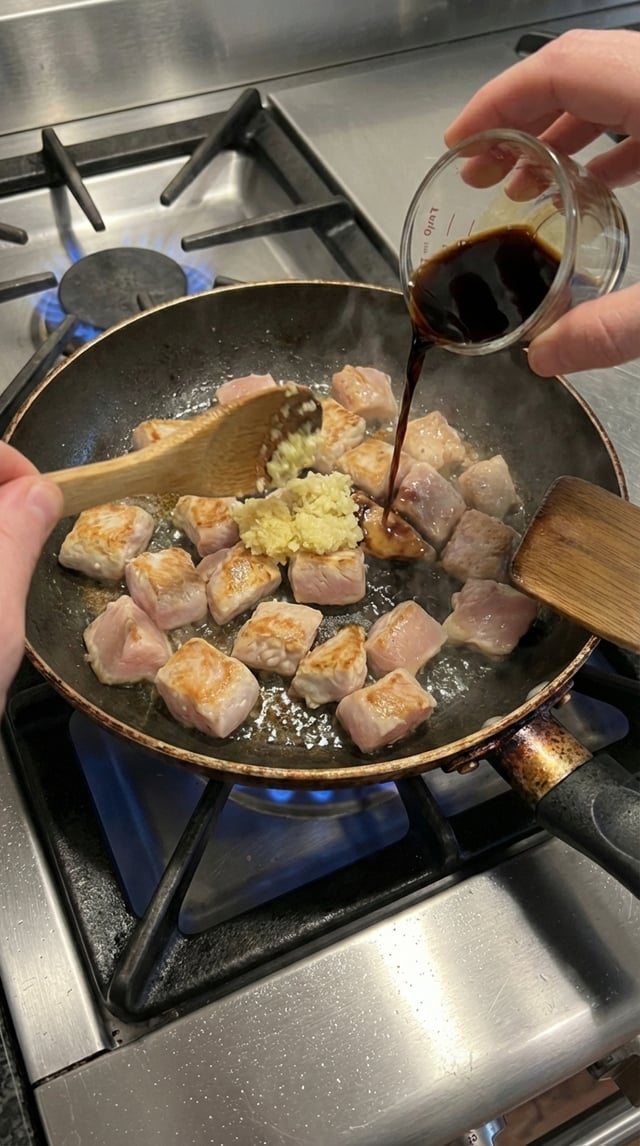 2. Season: Stir in the garlic, ginger, and half the soy sauce.