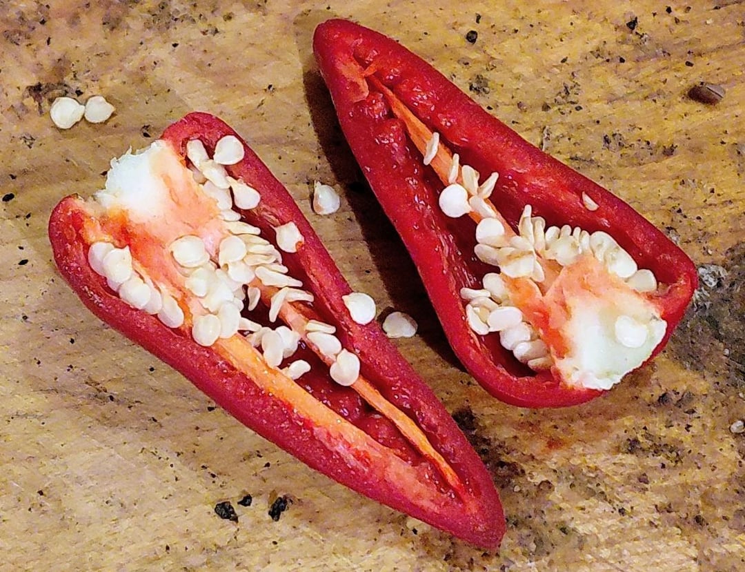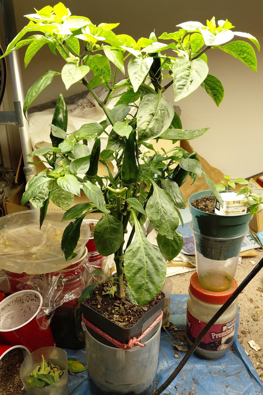 7 gorgeous (and delicious) Fresno chillies (2nd photo), harvested yesterday in Milwaukee, WI (Zone: 5b). The seed was planted on October 1st, wick watered from Day 1. There are 8 more green chillies ripening on the plant right now. My plan is to keep it in the 4" container until it moves outdoors into a 5-gal container, come spring. I imagine it's likely already rootbound, but this is an experiment. I'm hoping it will really take off once I free up and trim the roots when I transplant to a larger container.