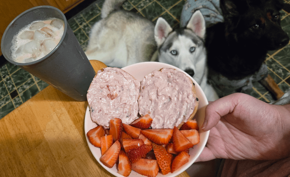 Bagel is Sola Blueberry Bagel (120), 1oz of Neufchâtel (a kind of low fat cream cheese, 70cal), and 3 tsp of SF raspberry preserve mixed with it (10 cal). Strawberries on the side for around 30 🙂 soooo full and I love that I can get my coffee in too. My dogs don't hate the free strawberry tops either