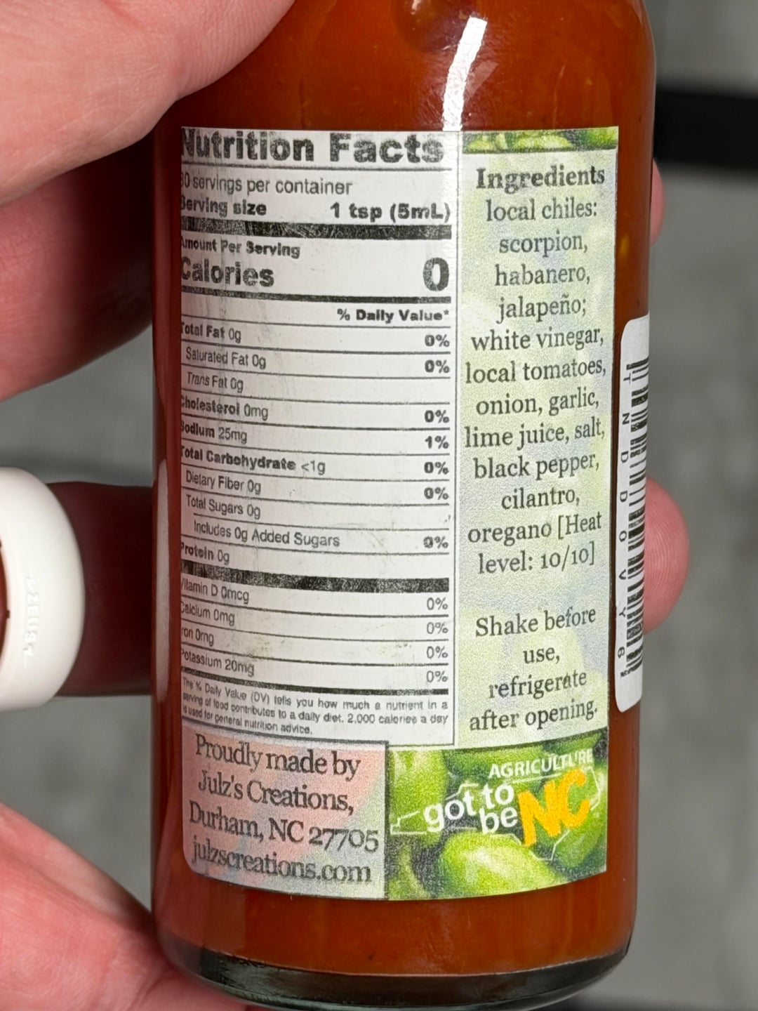 6/10 heat level (that’s subjective, everyone feels it differently). Great burn, great pepper flavor, not too vinegary. It’s a thin sauce and I love to mix it with cottage cheese in the morning.