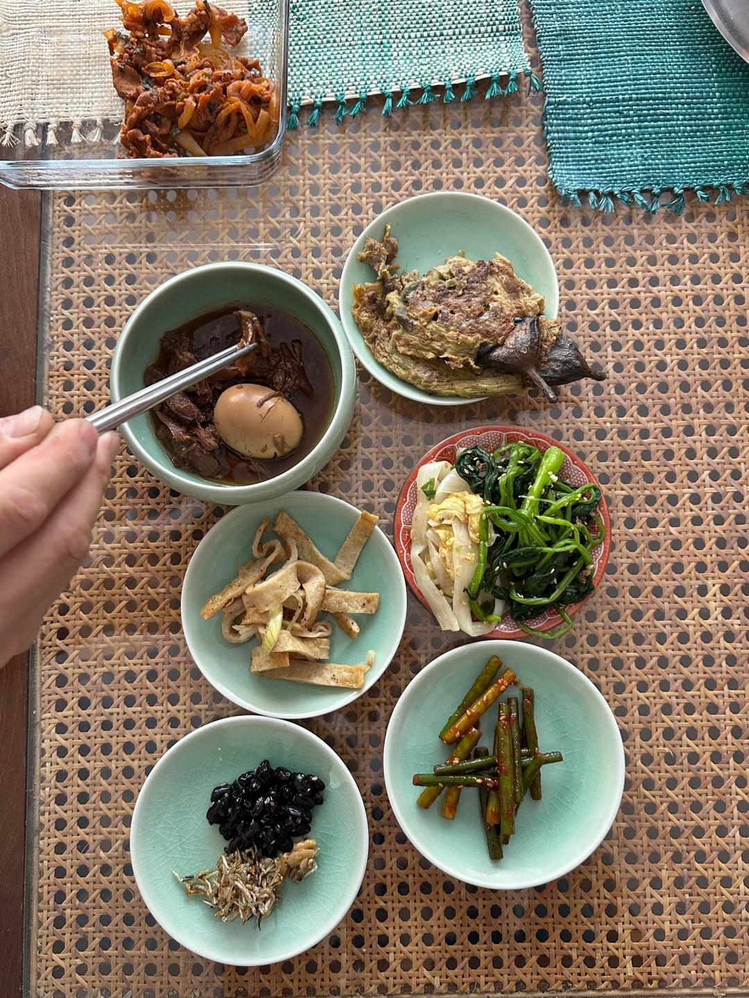 My rule is always at least 3 sides. One kimchi, one green leafy vegetable and then whatever strikes my fancy at the time or would go well with the soup or main dish.