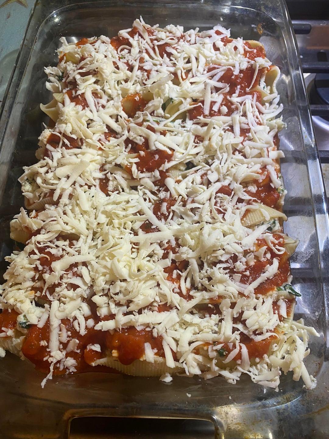 Spread 2 cups marinara on the bottom of the pan. Stuff the shells and line them up in the pan seam-side up. Pour the rest of the marinara on top with shredded mozzarella. Bake at 375 for 25 mins with foil on top. Then another 15 mins without foil. Rest for 5-10 mins.