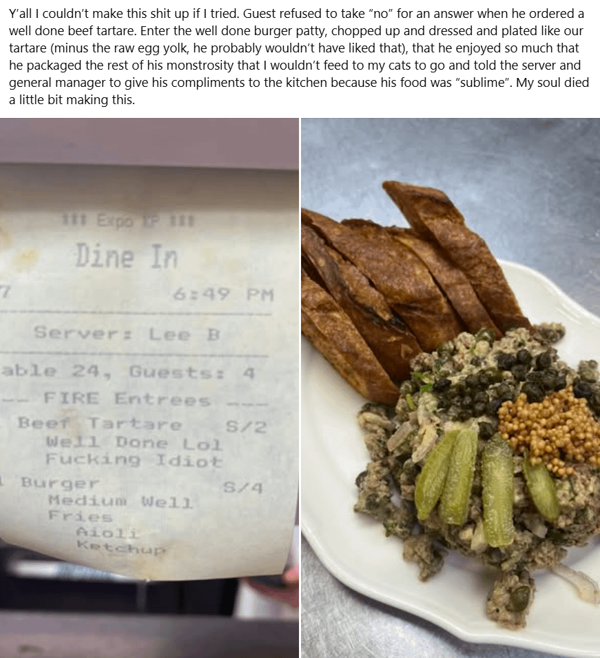 “I’d like my steak tartare well done” is a classic (and quite tired) joke. I am picturing the poor server first trying to roll with it with a hearty laugh before slowly realizing, wait, this guy is actually serious?!!