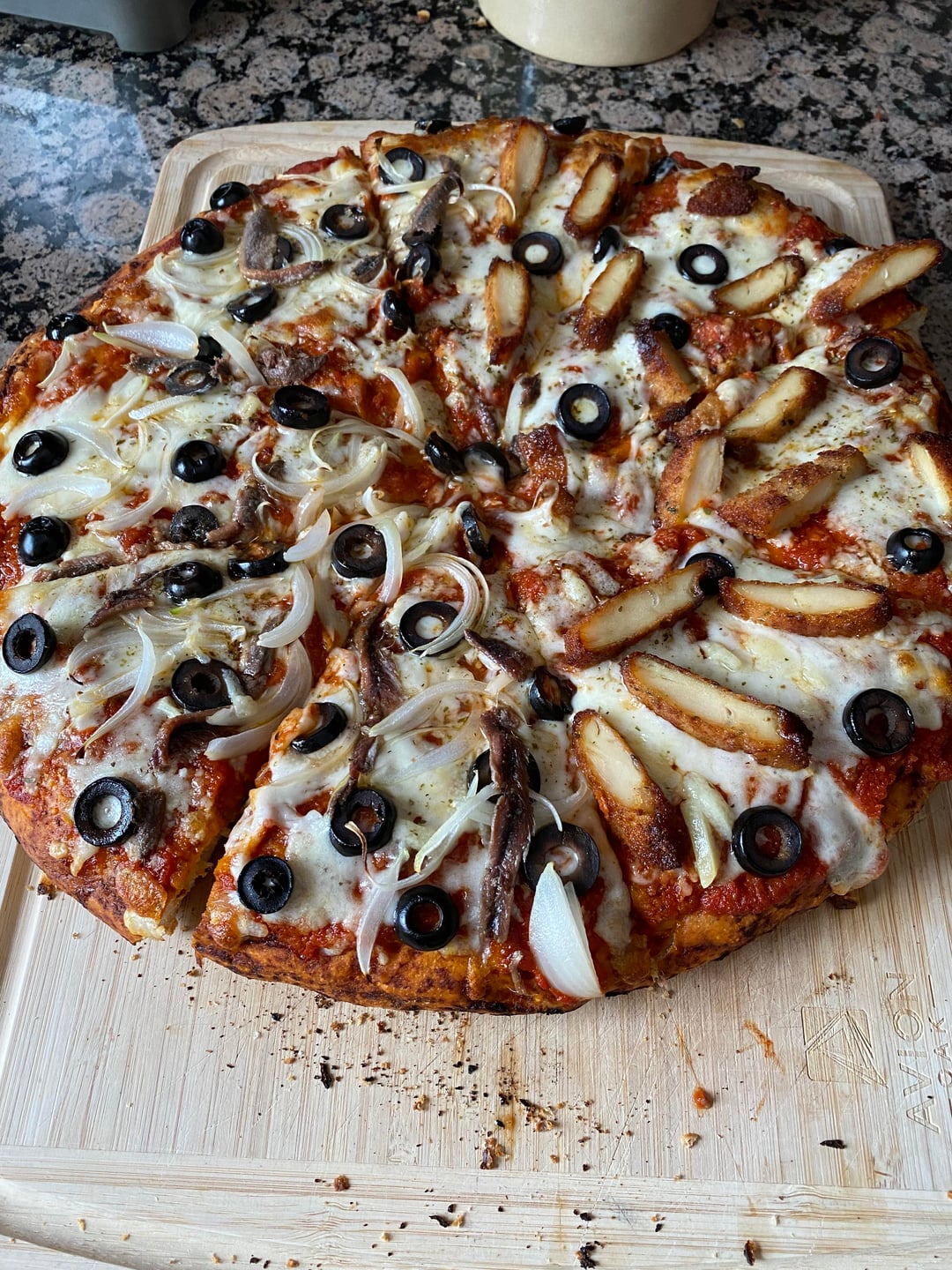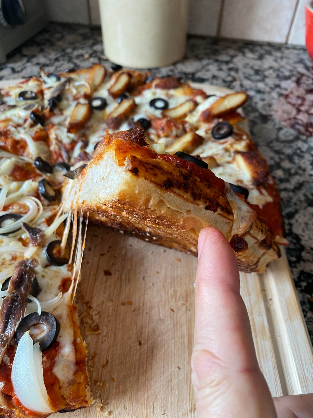bullrun001 7 days ago Made a half chicken cutlet, anchovies and onions, with all around olives, an all olive, sharp aged cheddar and a low moisture mozzarella.