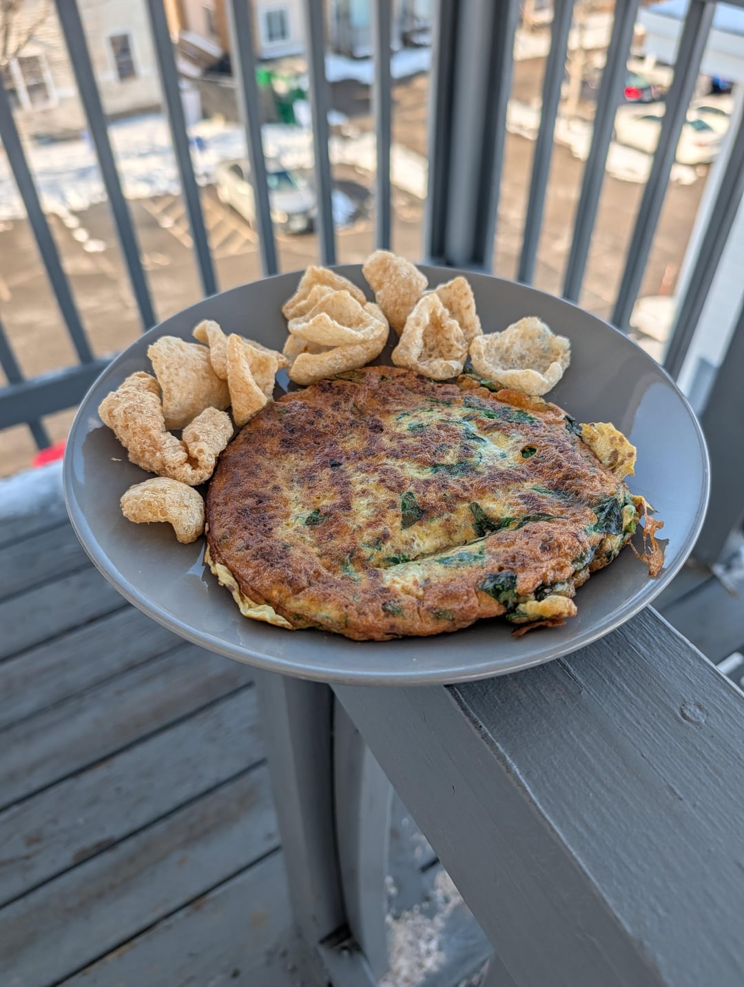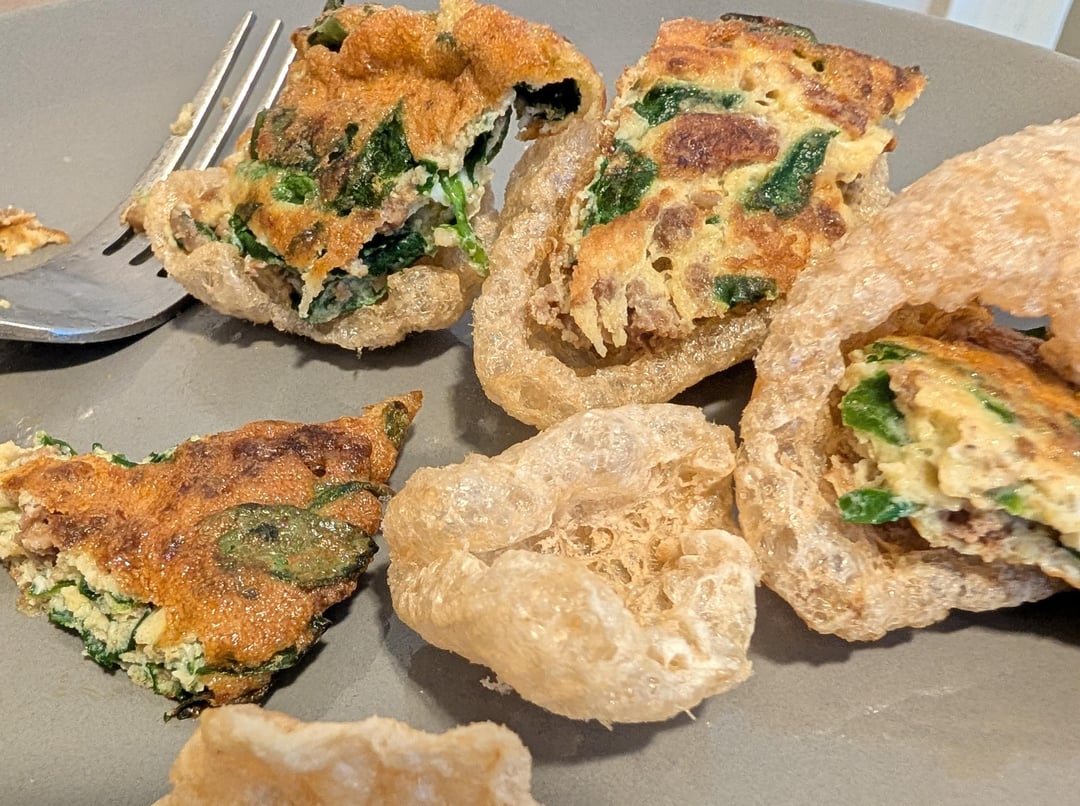 BBQ bacon cheeseburger mixture from this recipe – https://www.reddit.com/r/decentfoodporn/comments/1qjgsc6/bacon_cheeseburger_bites/ – plus two eggs and cut up spinach, fried in avocado oil, with pork rinds