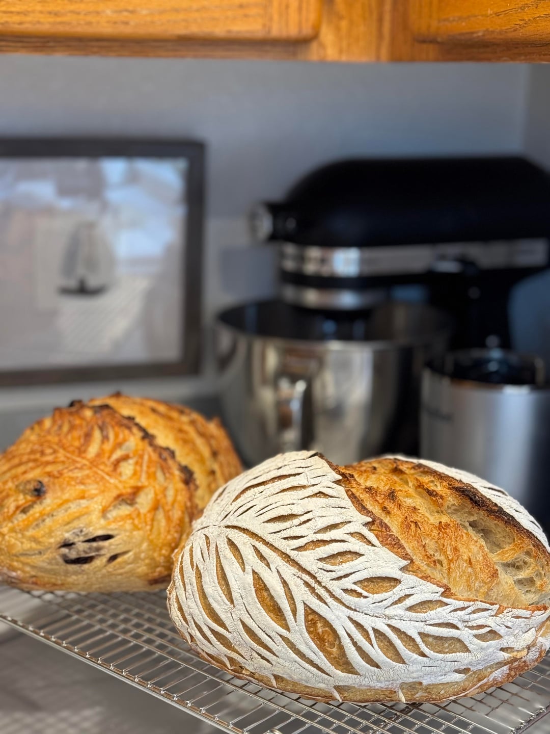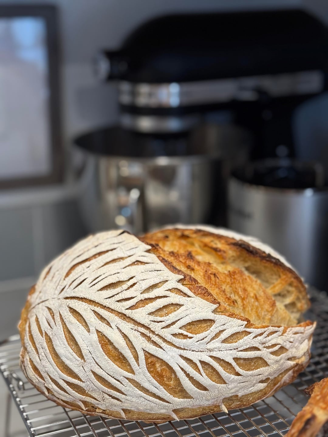 My recipe for decorative scoring: 325g warm filtered water 10g salt 110g starter 475g flour – mix, wait 30 mins, 1 round of stretch and folds, wait 30 mins, 3 rounds of coil folds over the next 1.5hrs, bulk ferment (I have a warm kitchen so usually 4 hours), bench rest 20 mins, shape and into the rice flour dusted basket, stitch after 10mins, covered and into the fridge overnight (12-15hrs), 1hr preheat at 500 degrees (Dutch Oven inside on Pizza Stone), loaf onto dough sling, brush off loaf, spray and evenly wet loaf, rice flour sprinkle and rub, decorative score, into the oven for 6-7mins, expansion score, back in with lid on for 15mins, lid off temp down to 475 for 15-20mins