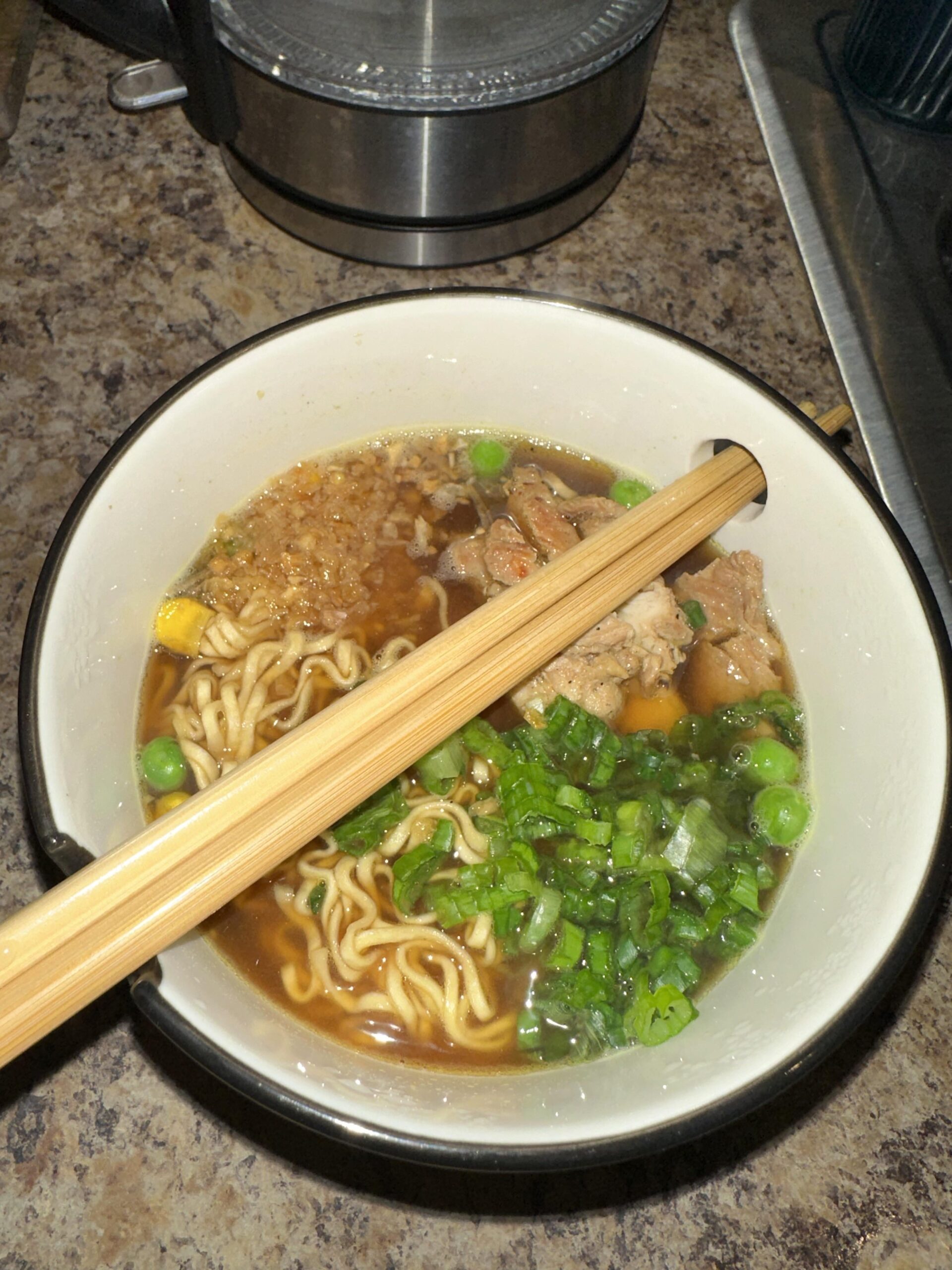 Simple but tasty, added green onions, teriyaki chicken, fried garlic and mushrooms under there somewhereby Work_for_tacos 9 Comments MCshador 7 days ago Seems really nice but I hate that plate. I can see myself spilling al out with that hole vicvonqueso 7 days ago How did you make the bowl though Fuzzy_Welcome8348 7 days ago Looks good! hezaa0706d 7 days ago Omg those bowls are so stupid. pieceofcakee 7 days ago How did u make the broth? Cardboardoge 7 days ago I got gifted a bowl like that and virtually instantly spilled a bit and never used it again TearyEyeBurningFace 7 days ago So if you lift your chopcticks stight up with it in the hole. Does it work as a handle? Just via the wedging action? SparklesAndSass1 7 days ago delicious! i just laughed at your bowl the soup can’t overflow or it’ll spill😅 sincerevibesonly 7 days ago That bowl is better off replicating the place where the chopsticks rest at the end rather than the hole 😖