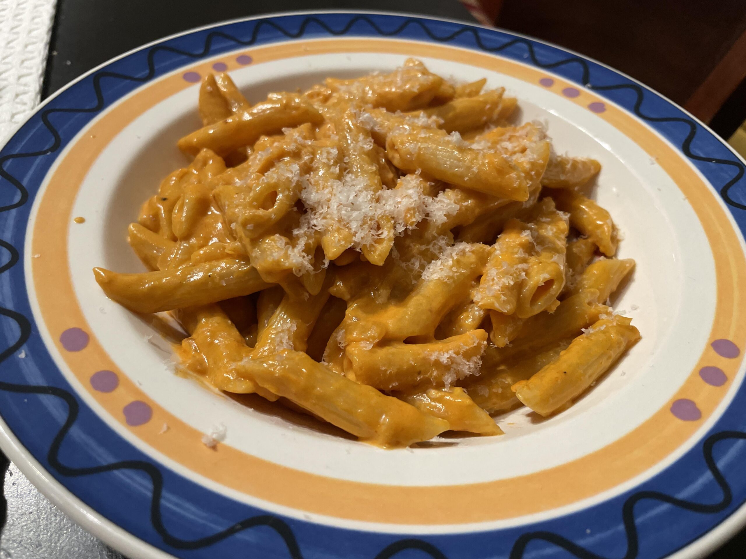 Some pasta alla vodka I made the other day with de Cecco dried penne. I lacked pancetta or guanciale to start my sauce, which I usually start by frying and then removing them, and taking out most of the leftover fat but leaving enough to flavor the sauce. I used bacon instead, which imo is actually my second favorite after guanciale.