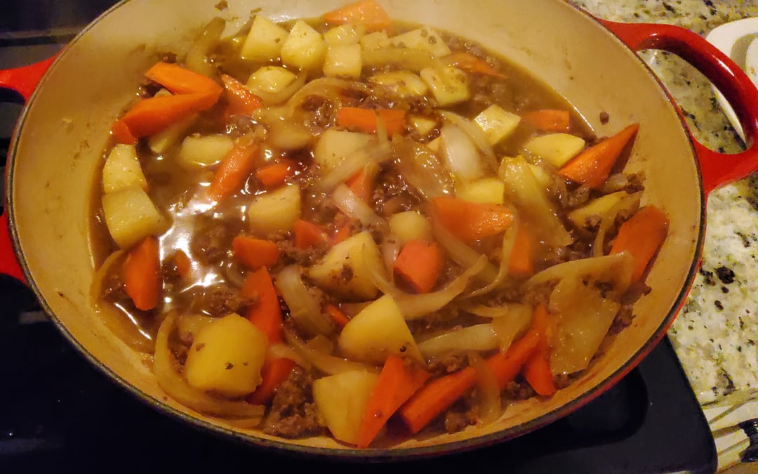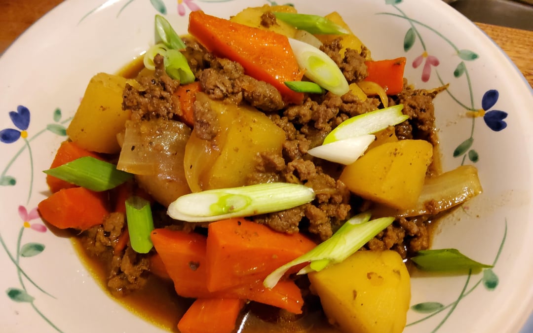 Took 2 frozen beef patties, one Idaho potato, 2 carrots, ginger, and half onion to make this soy sauce based beef stew.