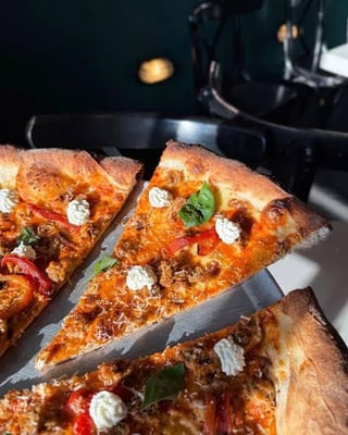 Pic 1: had one slice of this 10inch pizza (out of 6 slices) (mozzarella, voodoo sauce (it was like red and creamy?) chicken sausage, roasted red peppers, ricotta, basil and parmesan)