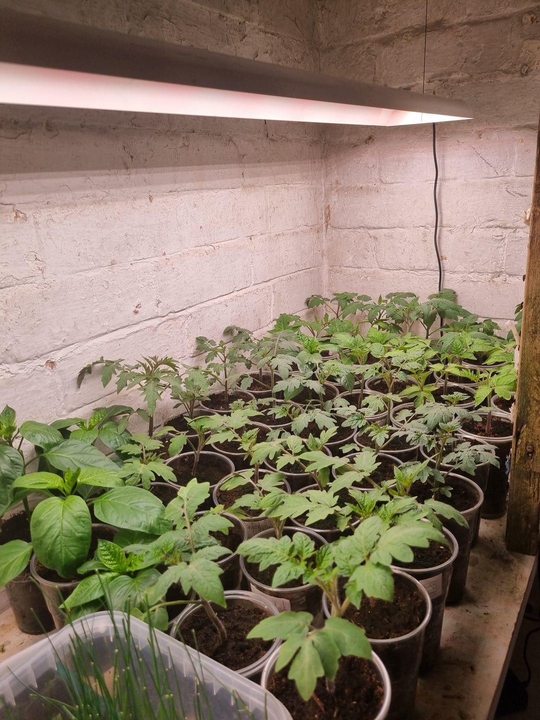 Nice set up! I have same 16 oz plastic cups for starters. What types of tomatoes does you grow?
