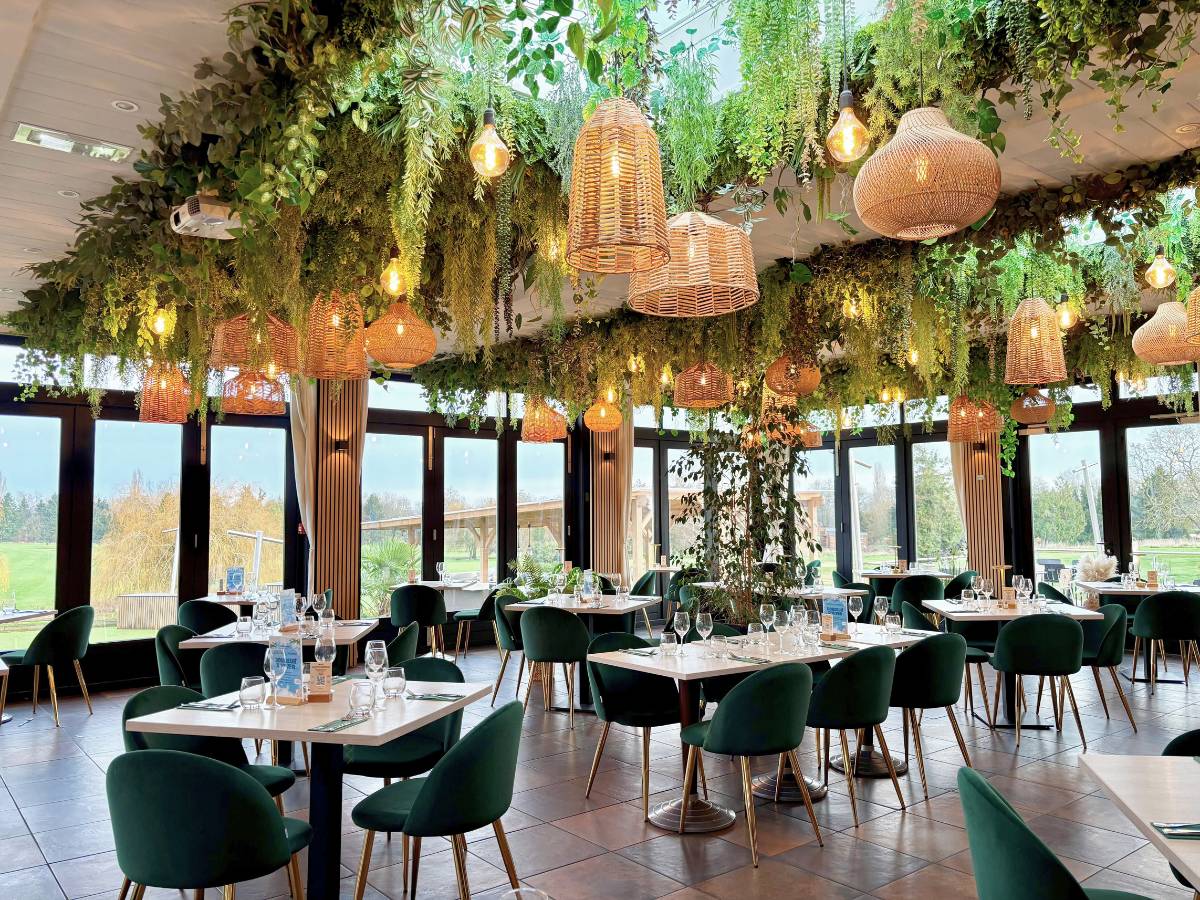 As soon as you walk in, you are immersed in an exotic atmosphere with a main room decorated with a green ceiling reminiscent of a lush jungle, inviting you to disconnect. The real added value is the spectacular view that is impossible to take your eyes off: the restaurant overlooks the golf course and offers a unique panorama of the green landscapes and animals on the estate, including alpacas and Cameroon sheep.
