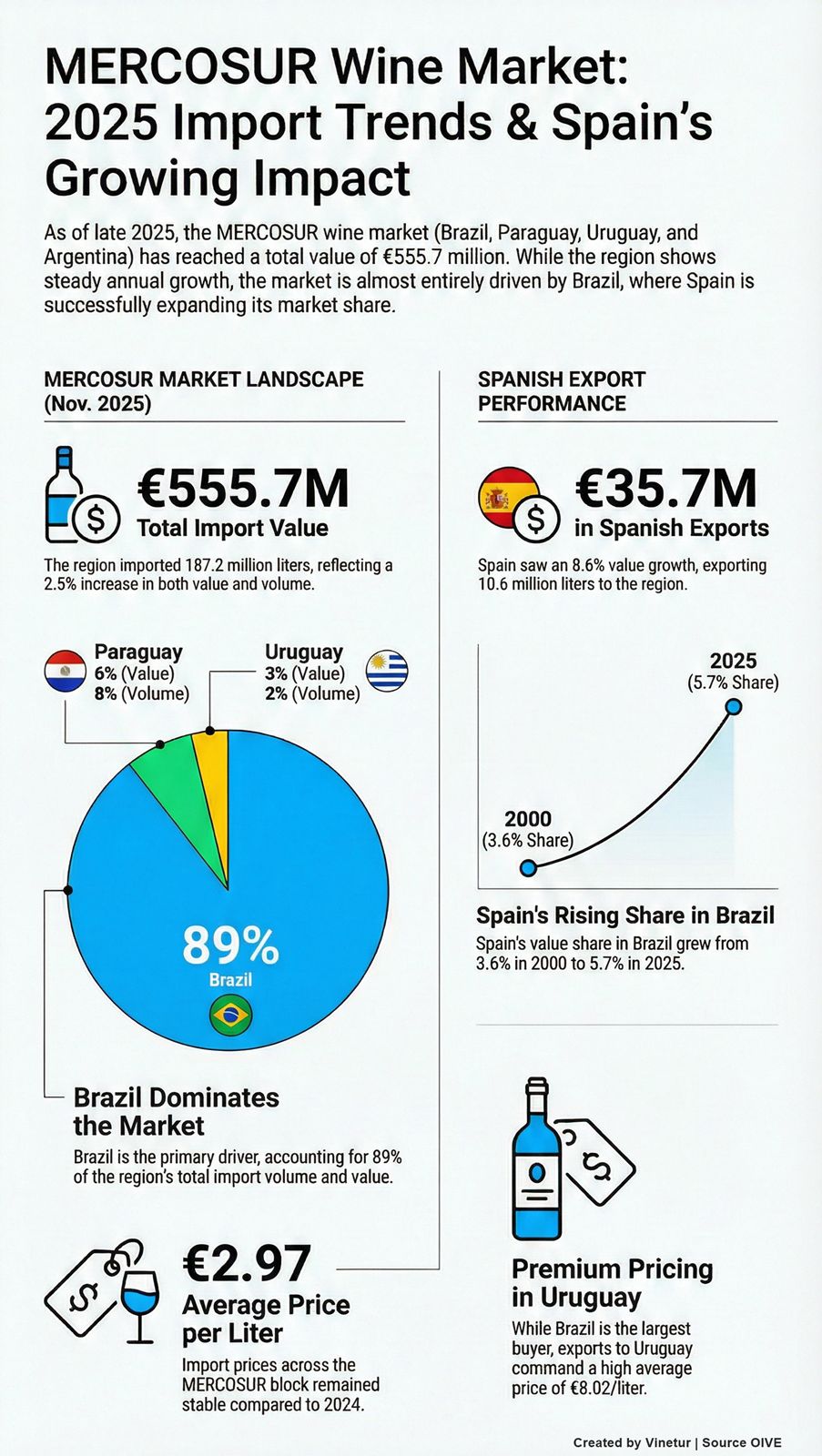 Wine imports by the four MERCOSUR countries—Brazil, Paraguay, Uruguay, and Argentina—reached 187.2 million liters in the twelve months from December 2024 to November 2025, according to official data analyzed by the Interprofessional Wine Organization of Spain (OIVE). The total value of these imports was €555.7 million. Both volume and value increased by 2.5% compared to the same period in 2024. The average purchase price remained stable at €2.97 per liter.