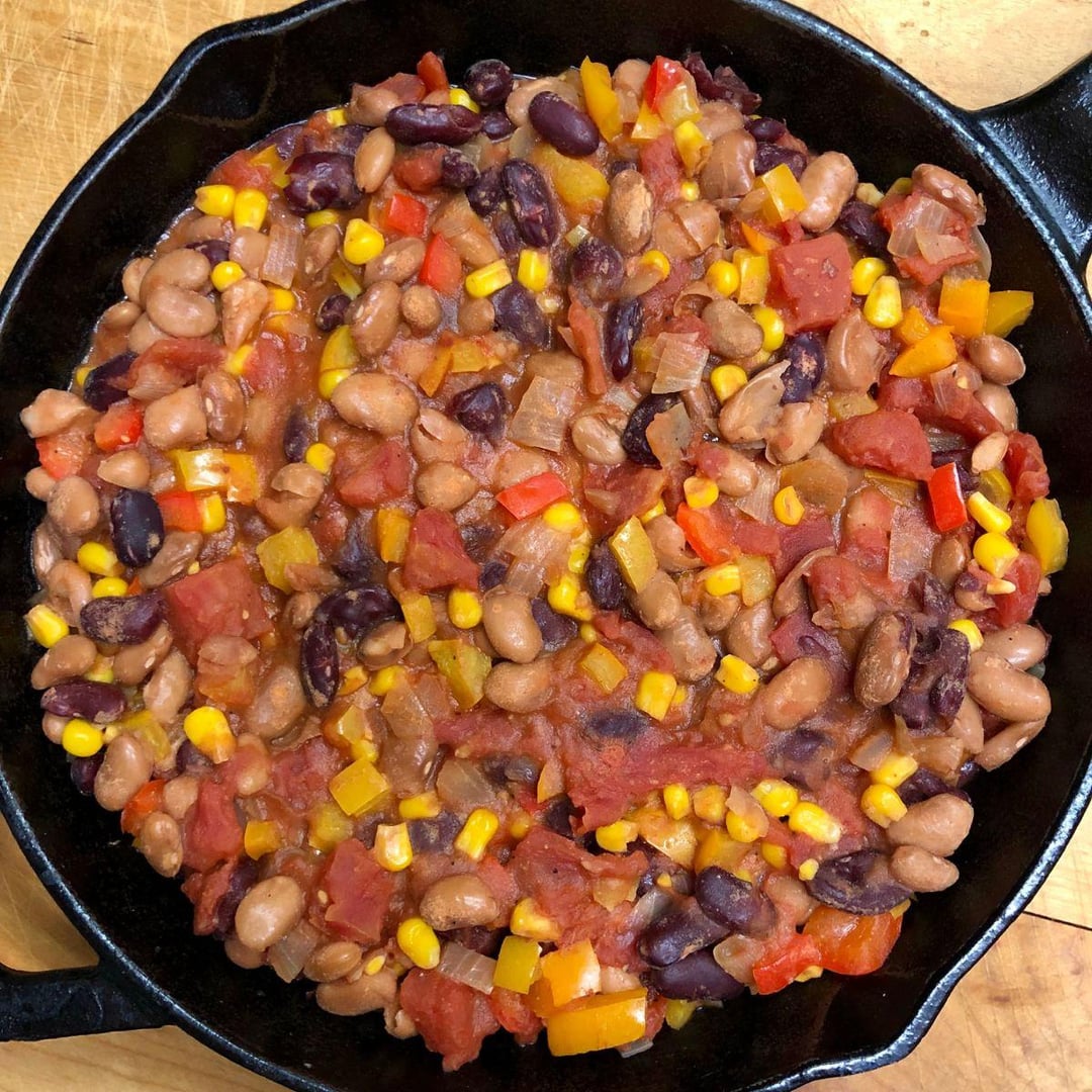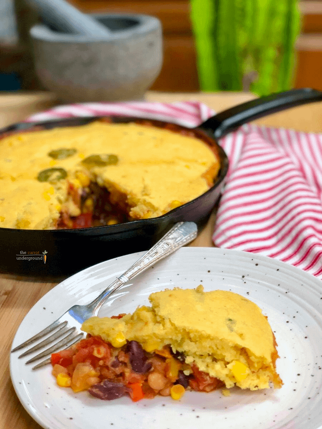 Vegan Texas Tamale Pie 🌶 a hearty & zesty 1-pan dish with beans, peppers, tomatoes & sweet corn baked with a homemade cornbread topping