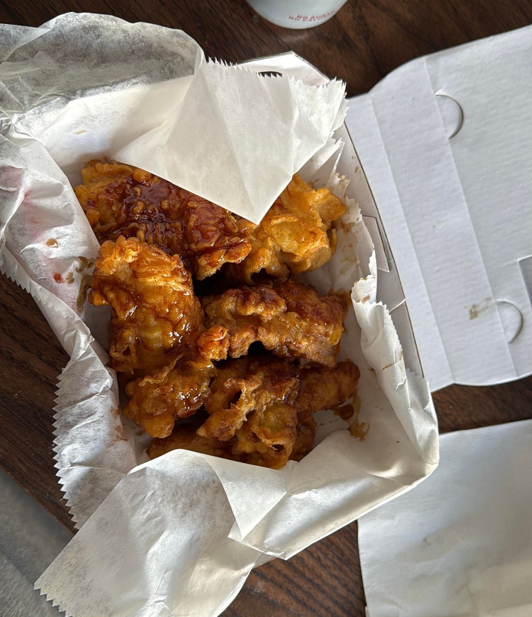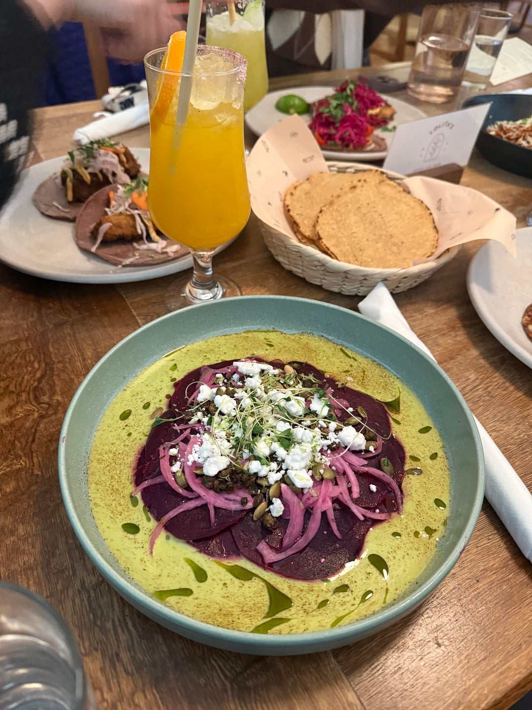 Passion fruit mocktail, and tiradito de beet (red beet, feta, capers, carrots, pickled red onion), Korean boneless fried chicken soy garlic flavor (8 of them).
