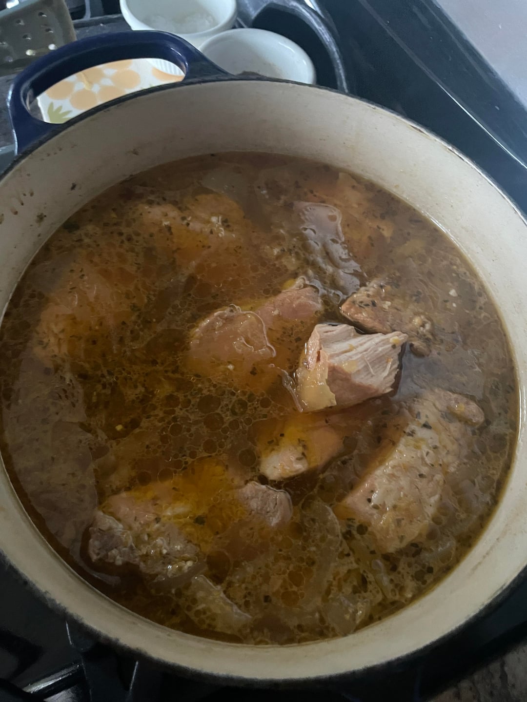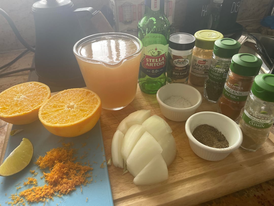 2lb pork shoulder with the ingredients pictured. Sear pork in oil or butter, lightly sauté onion and garlic, add spices, orange zest/juice and 2cups liquid. Bring to boil, stir and simmer covered for 3-4hrs. Strain, shred and sauté until edges are just crisp. Season to taste.
