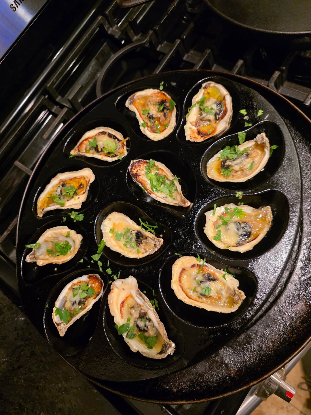 Chebooktooks from New Brunswick raw. Misty Points from Chesapeake Bay grilled with olive oil, black garlic and Parmesan, Romano, and Asiago cheeses