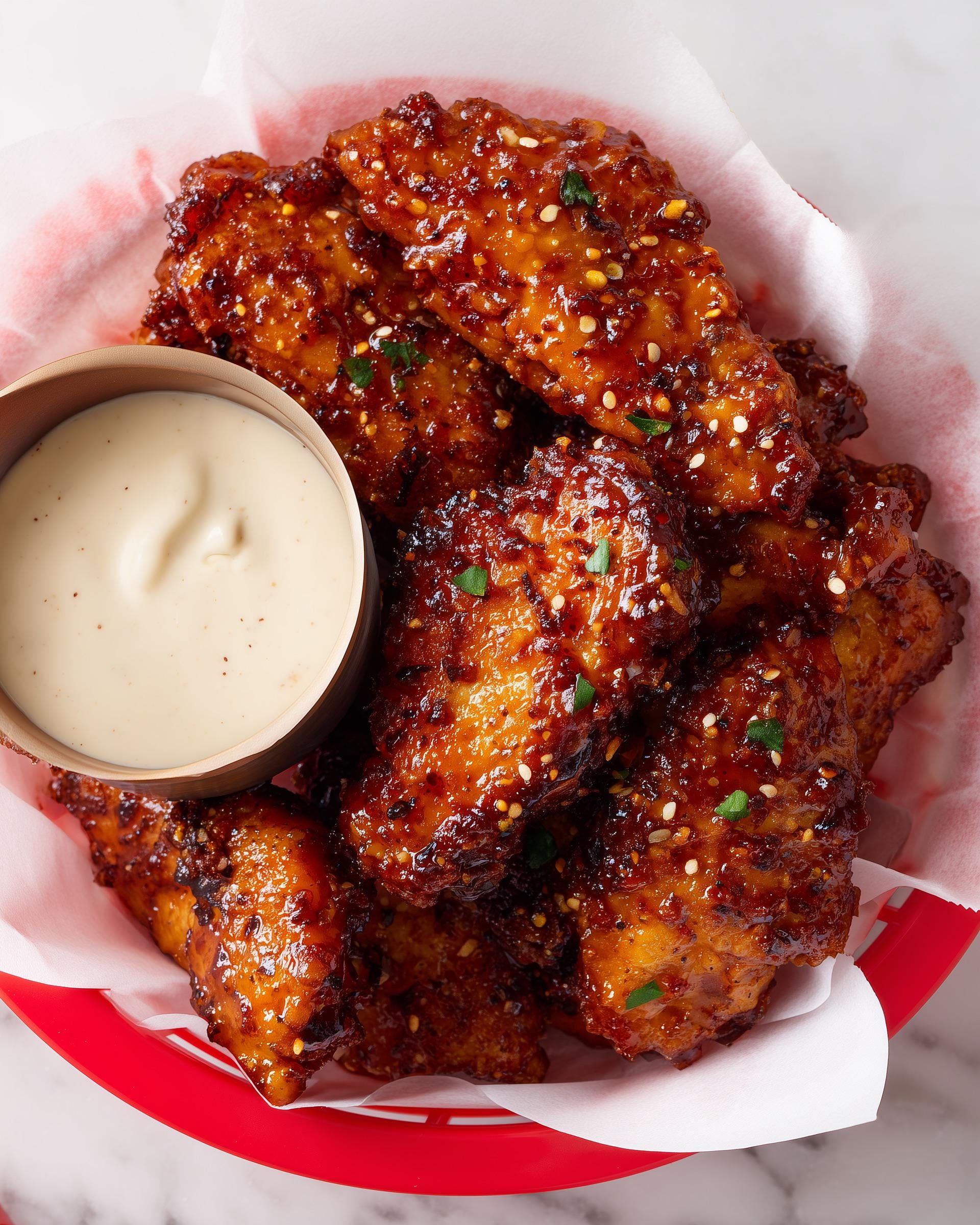 Melt vegan butter with hot sauce, maple syrup, and garlic powder. Toss the hot wings in the sauce until glossy and evenly coated.