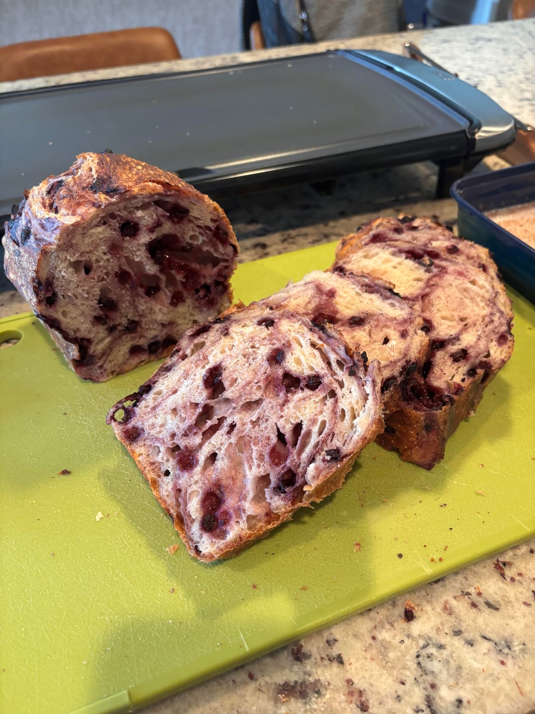 I used my basic bread recipe (100g starter, 325g luke warm water, 500g KA bread flour, 10g salt) and added 2 cups frozen wild blueberries and 2 tablespoons cinnamon at the second stretch and fold.