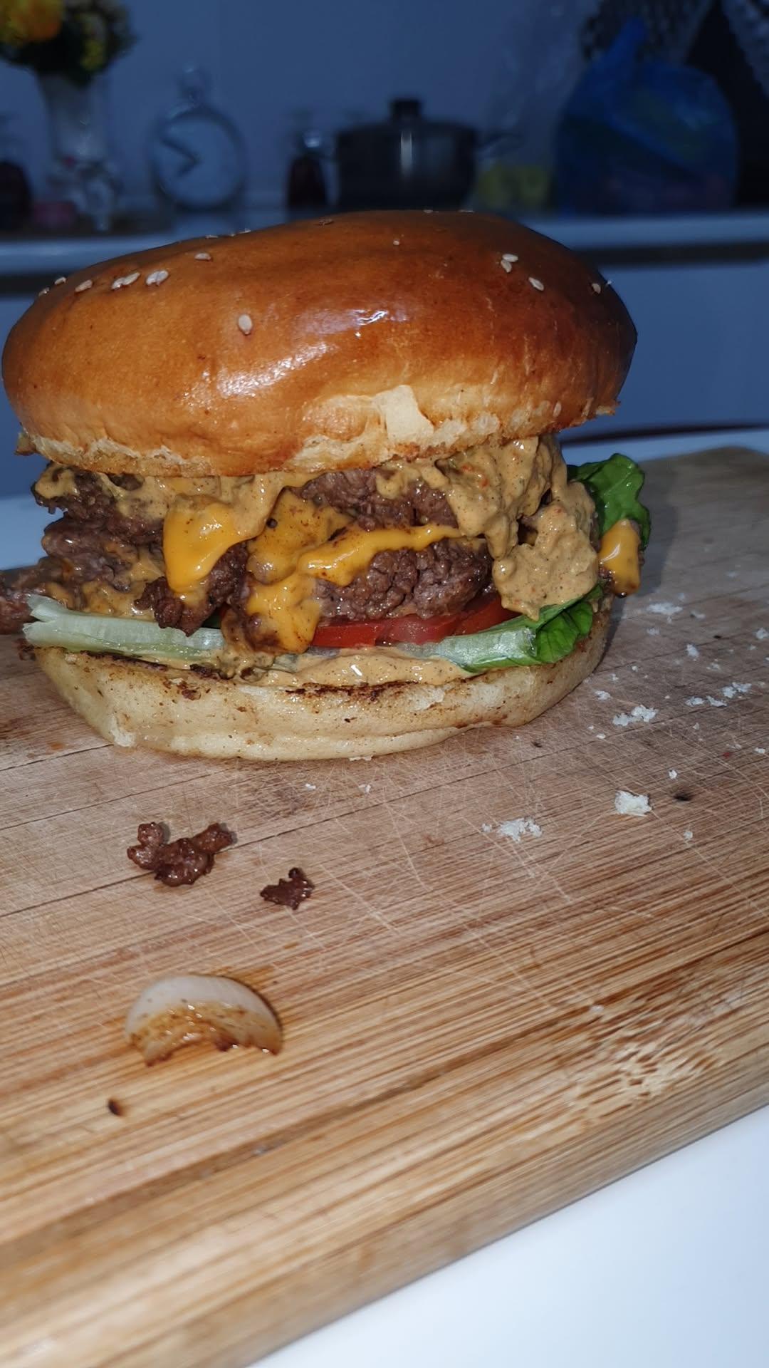 Greetings everyone, I hope you're doing well. So I wanted to try making my own burger. Although I found a recipe from a youtube short yet it was delicious, Like I didn't expect to come out that good ( considering I do not know how to cook lol ), It was a recipe for smash burger. One thing I got wrong was the meat, I made two burgers and one of them collapsed when I flipped it over but I managed to put it together by putting the cheese on top. it was surprisingly spicy thanks to my pickles that I used for the sauce but overall I'm pleased with it. How does it look?