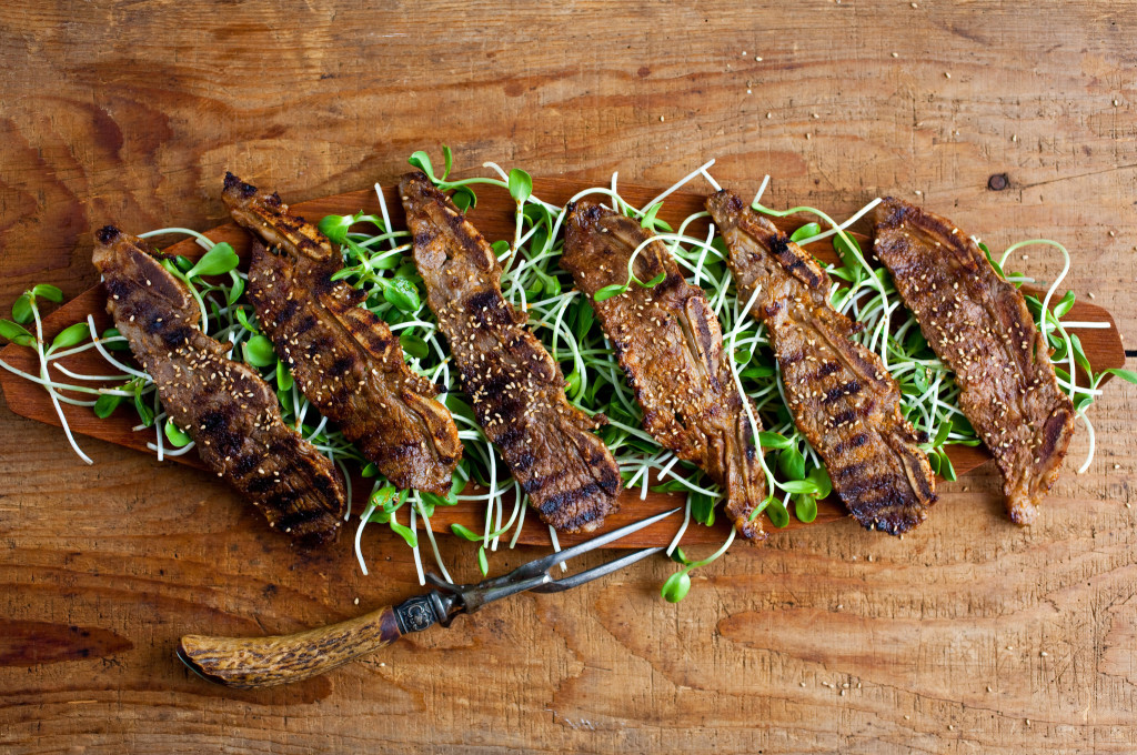 2. Coat flanken with just enough of the mixture to cover it; there should be some left over. Let it marinate, covered, for at least 30 minutes at room temperature, or up to 24 hours in refrigerator (the longer the better).
