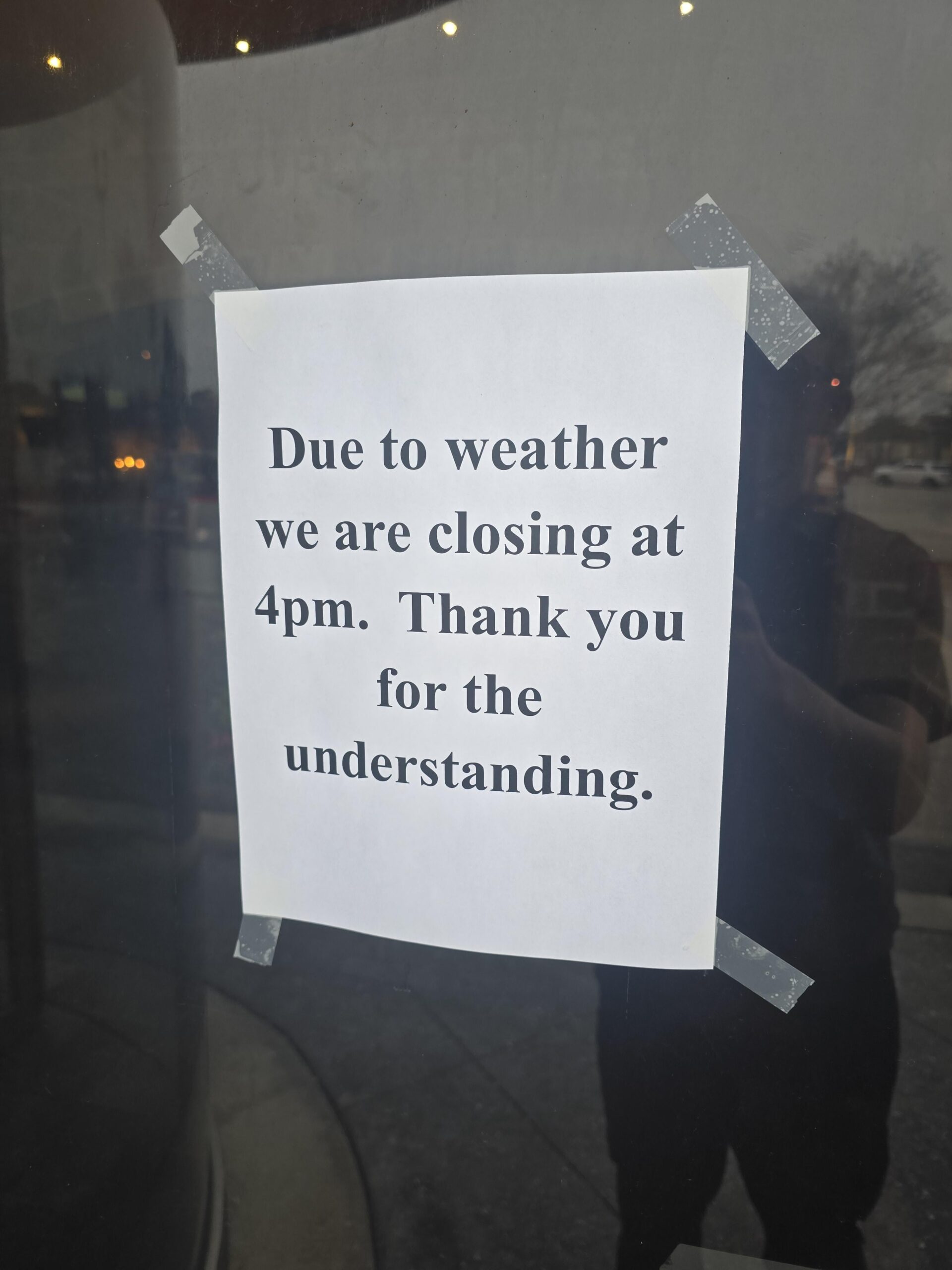 They have nowhere to go, or nobody to see so let’s estimate they left at 7:00 EST. Way over posted closing time. Ice/ snow be damned I guess.