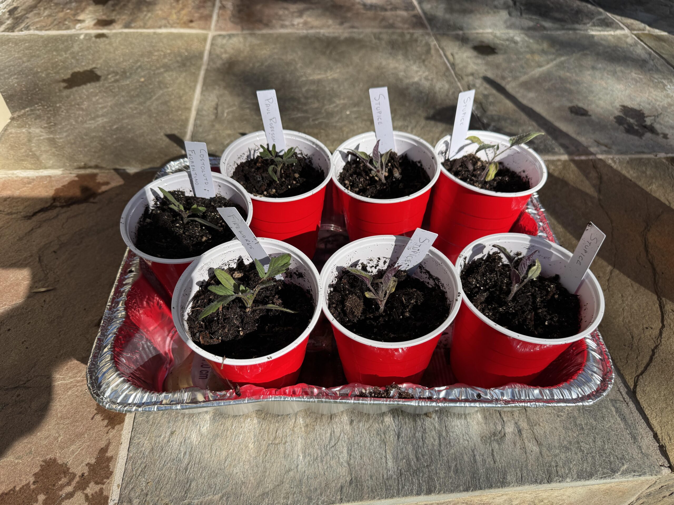 I have a good set of seedlings and I just transplanted a bunch to 16oz cups. The four on the right side of this picture are supposed to be Stupice. They don't even look like tomatoes to me. The leaves are a smooth palm shape. The ones on the left are Paul Robeson, Costoluto Fiorentino, and Fireworks.