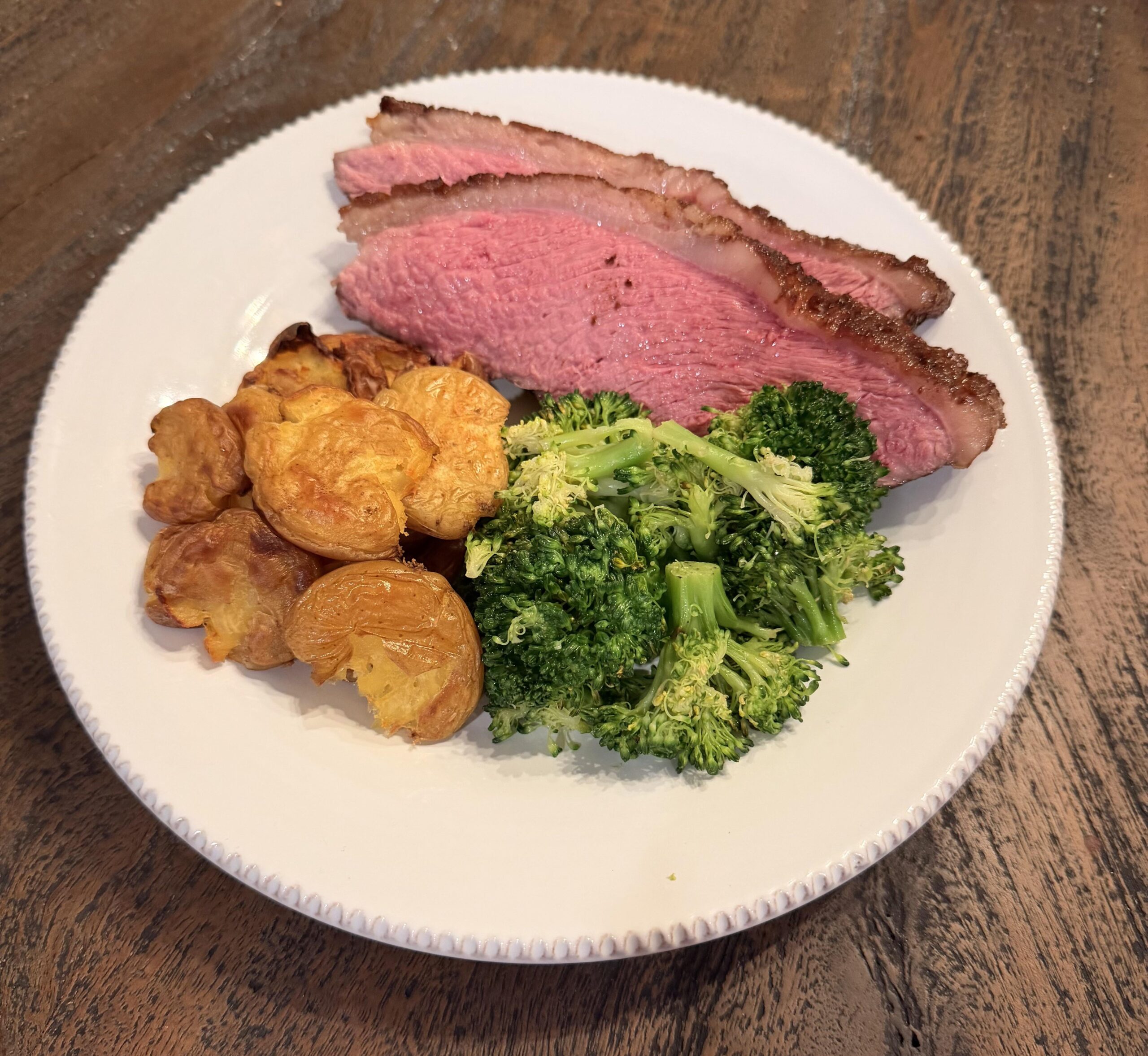 6. The only thing this plate is missing is sauce. Garlic butter on the smashed potatoes and the broccoli, hunter or 3 peppercorn sauce on the steak – would be my choice. Otherwise, good job!