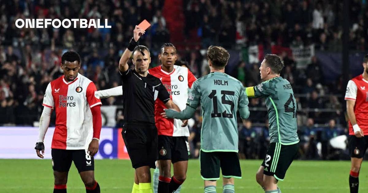 Referee Rohit Saggi shows a red card to Daizen Maeda during the UEFA Champions League match between Celtic FC and BSC Young Boys at Celtic Park on January 22, 2025. (Photo by Ian MacNicol/Getty Images)