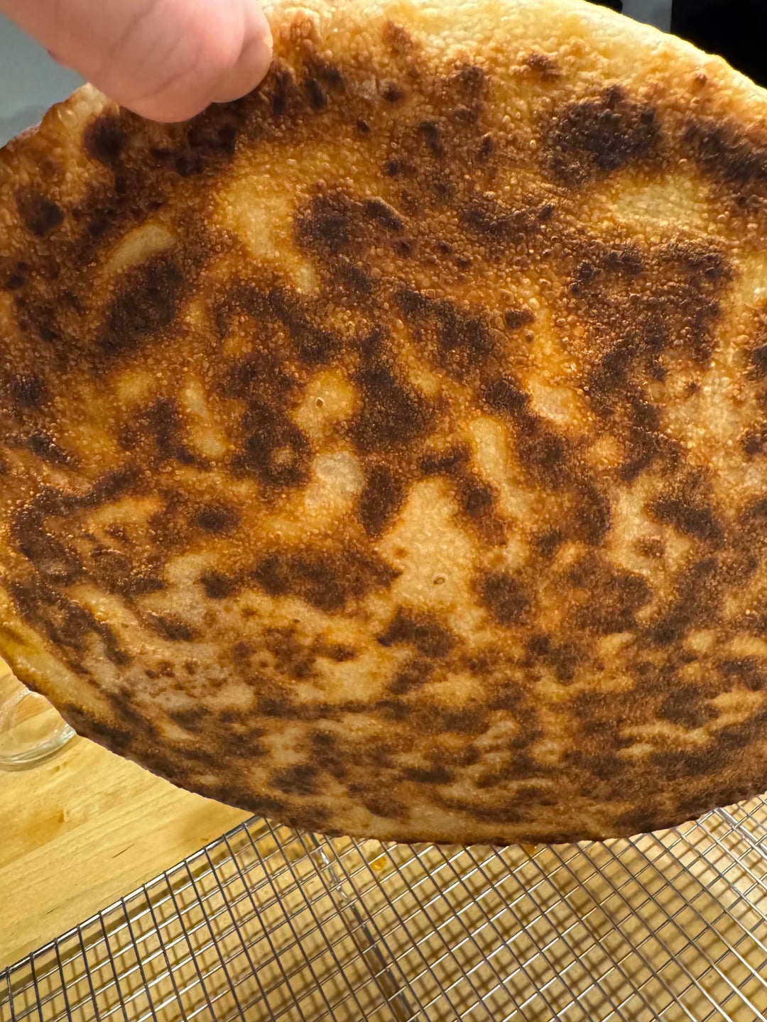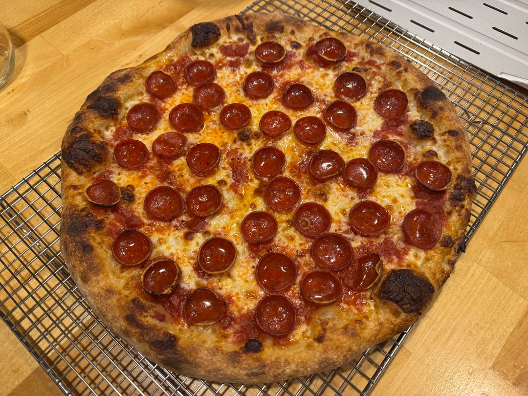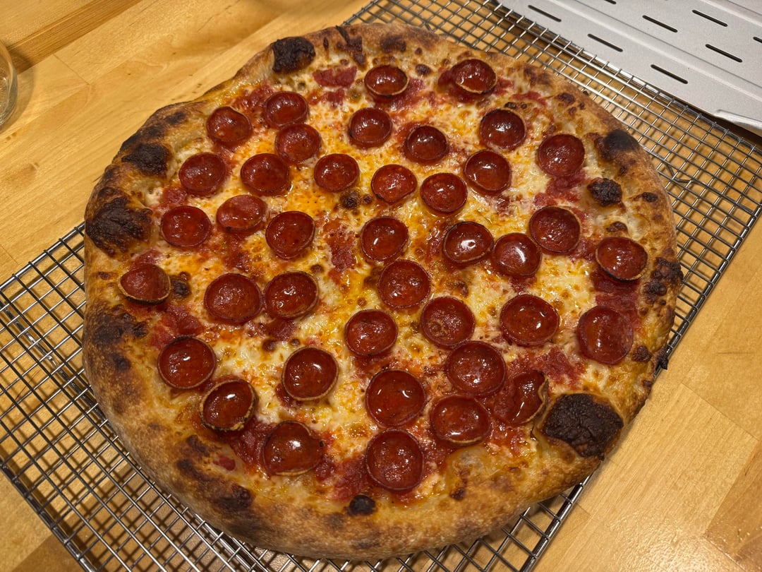 4 day cold fermented direct dough at 68% hydration. Cooked at 530 for 6min. Broiler for about a minute. Dough ball was 370g. Stretched to 13inch. Baked on Steel. Airy and crunchy. Very happy with this one.