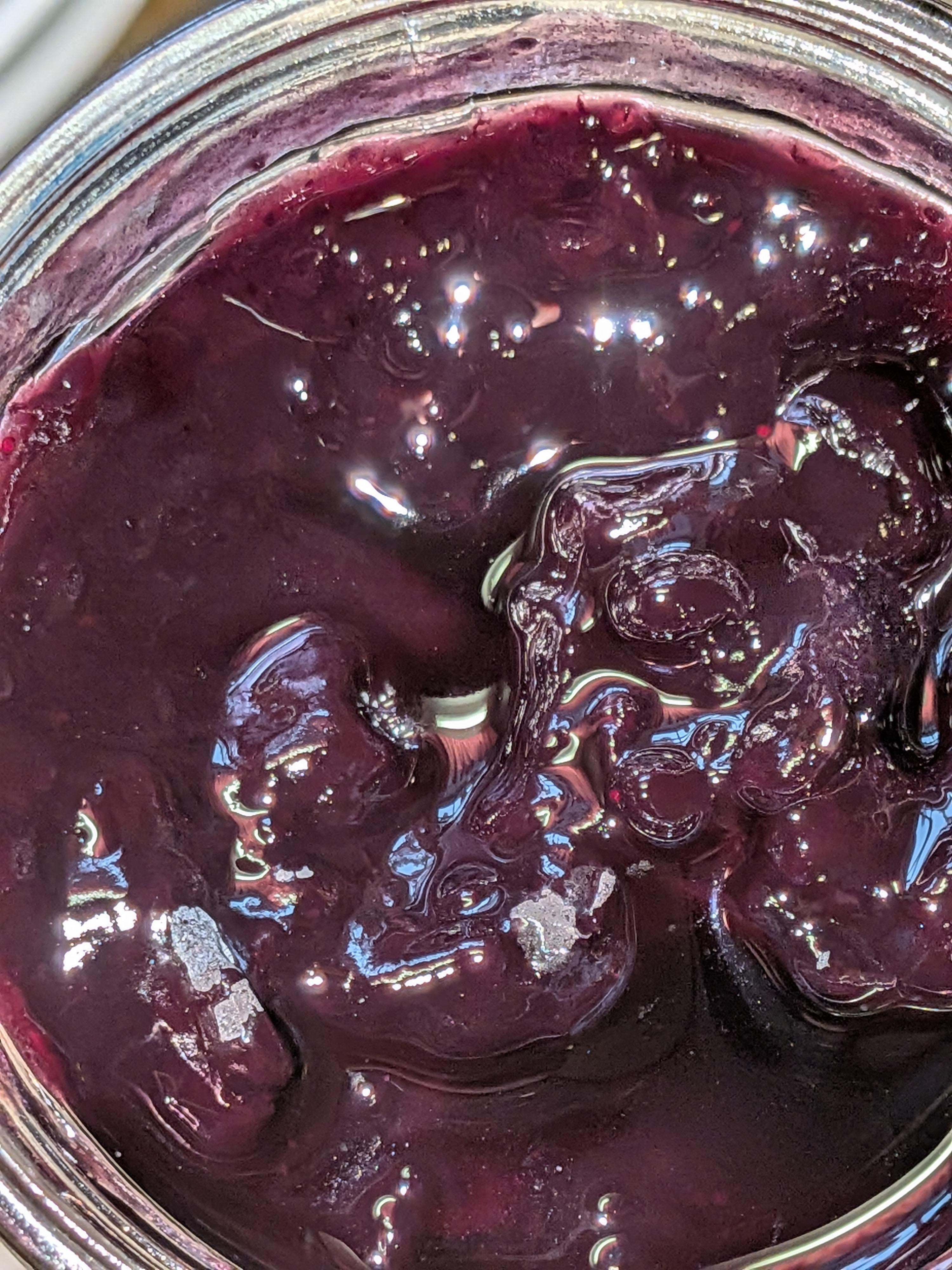 I just pulled out some blueberry jam from last year. I followed Ball's recipe to the T. I have 3 jars like this, completely sealed. I wonder if it's crystals because it's not fuzzy.