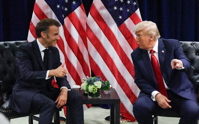 US President Donald Trump (right) holds a bilateral meeting with France’s President Emmanuel Macron on the sidelines of the United Nations General Assembly in New York City on September 23, 2025. (Ludovic MARIN / AFP)