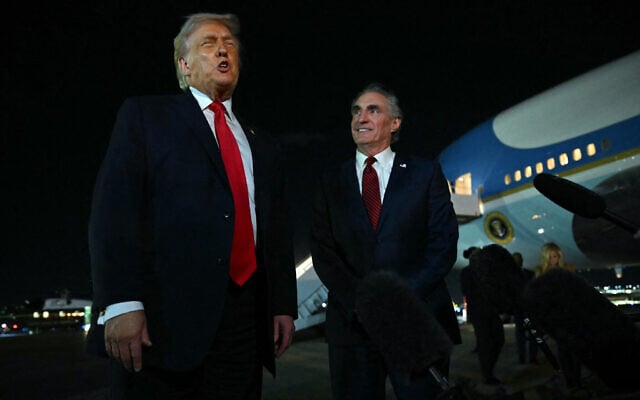 US President Donald Trump speaks with reporters as the Secretary of the Interior Doug Burgum (R) looks on, before boarding Air Force One at Palm Beach International Airport, in West Palm Beach, Florida on January 19, 2026 (ANDREW CABALLERO-REYNOLDS / AFP)